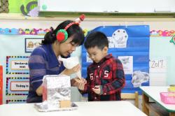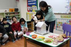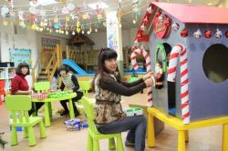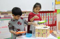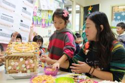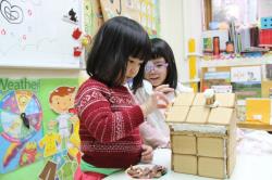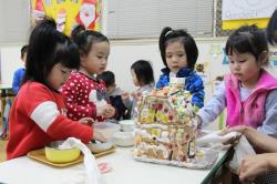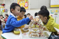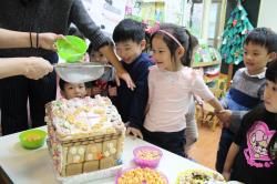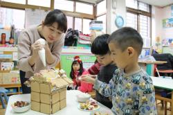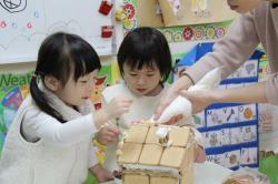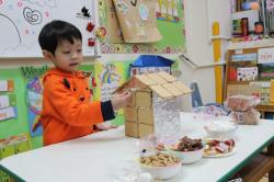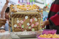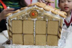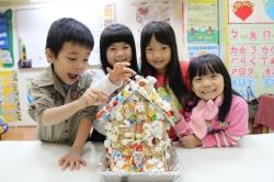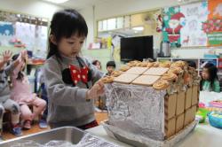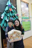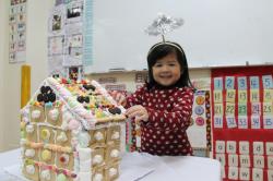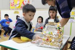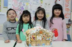 在各班也有著糖果屋DIY製作,不論是合作性或獨棟的,運用糖霜固定各式造型糖果及餅乾,每班的糖果屋造型搭建的各有特色,並將糖果屋點綴的色彩繽紛,小朋友迫不急待想享用它,真是甜甜的一天,充滿甜蜜夢幻幸福的感覺喔!