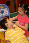 Baby班年紀小,不敢嘗試敷臉,Tiffany老師示範後請小朋友幫忙拿黃瓜