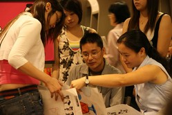 『相親相愛』團體活動中,大家必須一起想辦法站在一張報紙上。