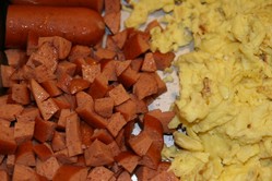 這是做飯團需要的材料,糯米、肉鬆、菜圃、油條