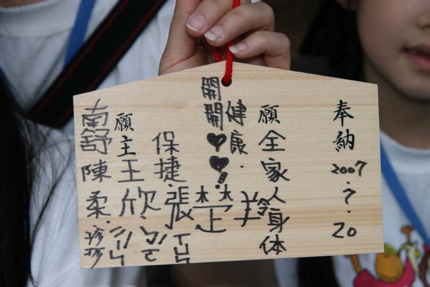 在清水寺裡,各組師生們一起討論待會在祈福牌上寫下什麼祝福