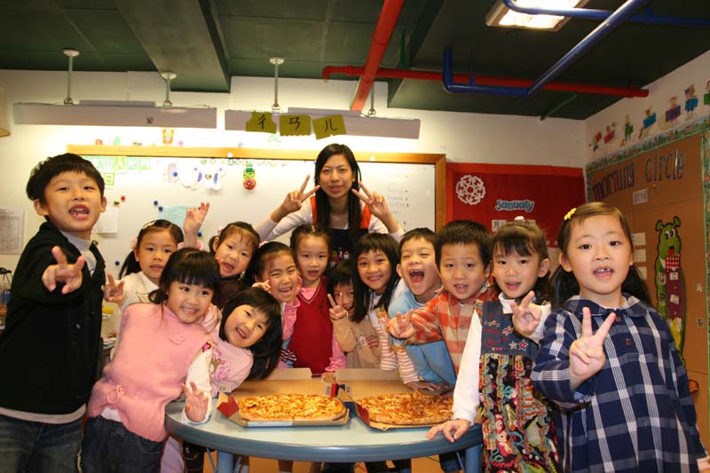 Qoo老師和K2班小朋友開心地準備享用松鼠王大賽的獎品Pizza