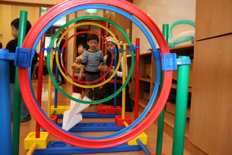 家嫻老師主持的穿越呼拉圈的飛機,學凡小朋友準備瞄準好將飛機奓向最後一個圈圈唷!