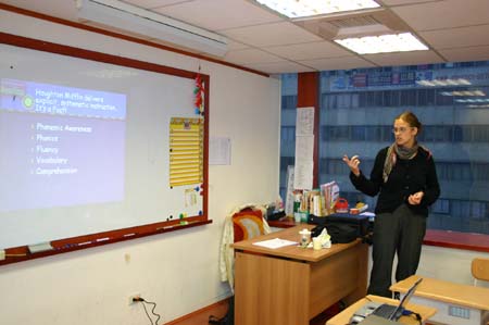 教務長吳老師向大家介紹凱斯圖書室。並介紹孩子們最喜歡的Tommy手偶