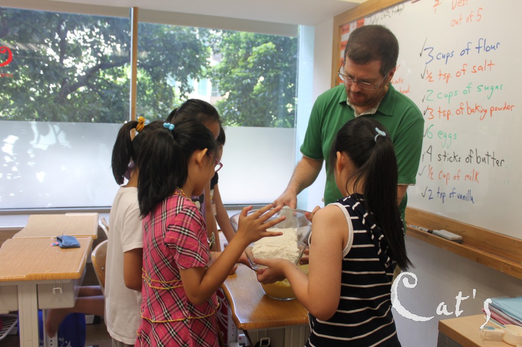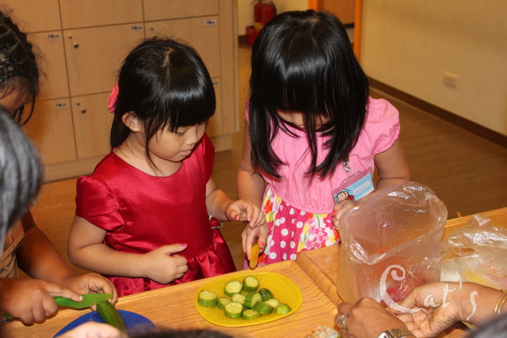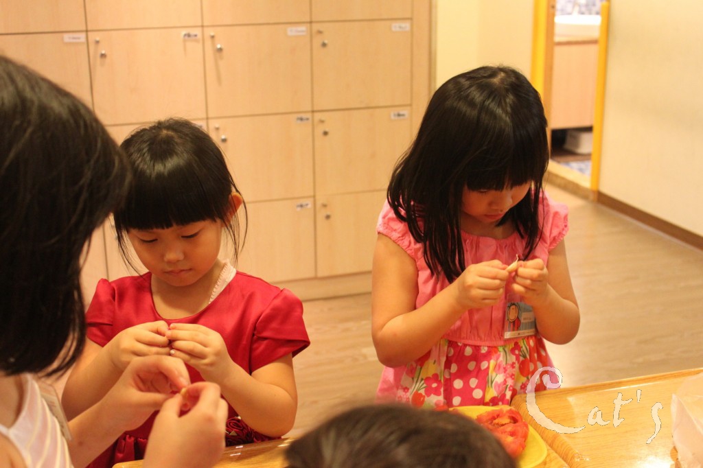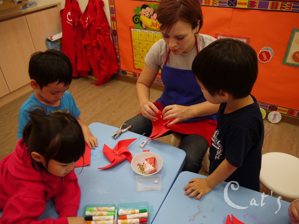 Teacher Angela教小朋友們用色紙摺成魚鰭