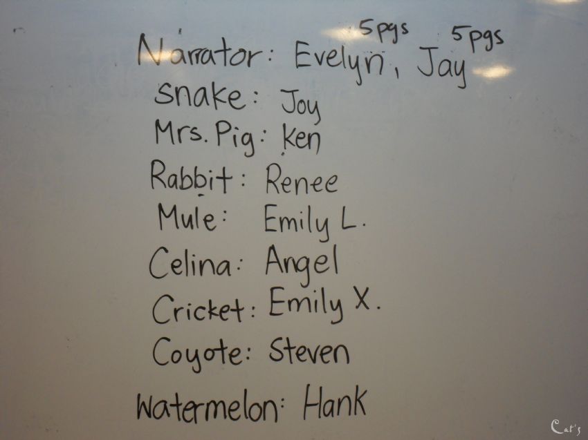 Steven 擔任土狼,他在故事裡要發出"howl howl"的聲音,要幫忙Celina叫醒睡在西瓜田裡的Mrs.Pig!