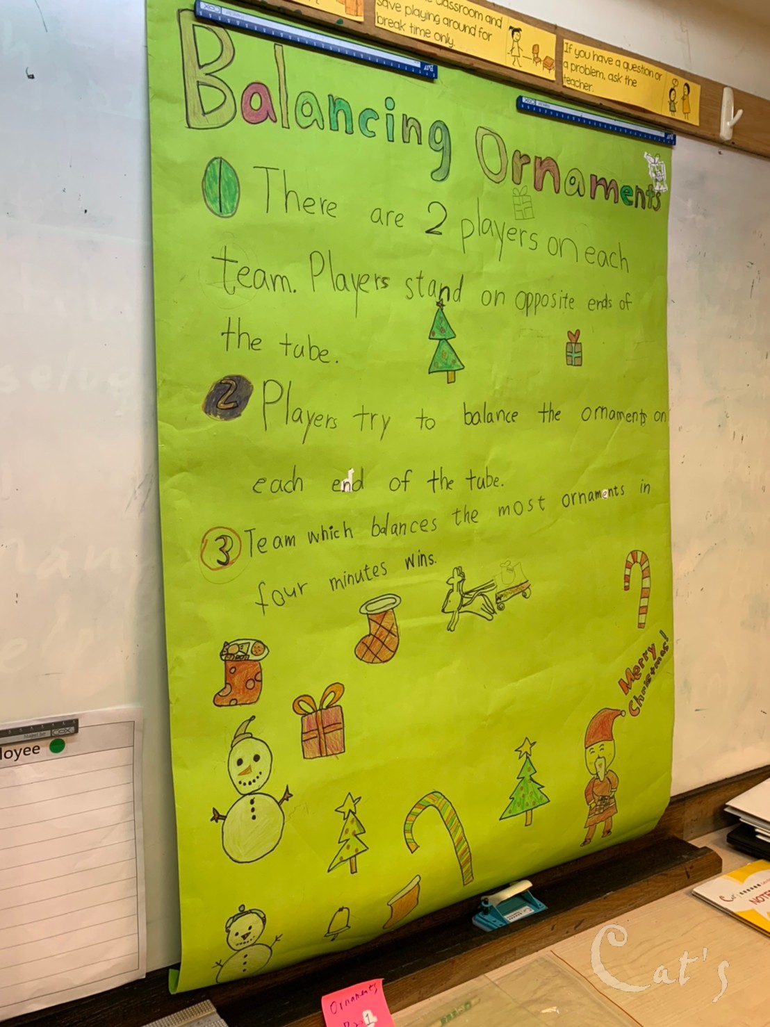 Oh! I know! We must balance as many Xmas ornaments on the stick.