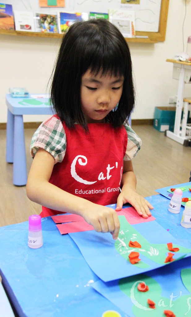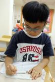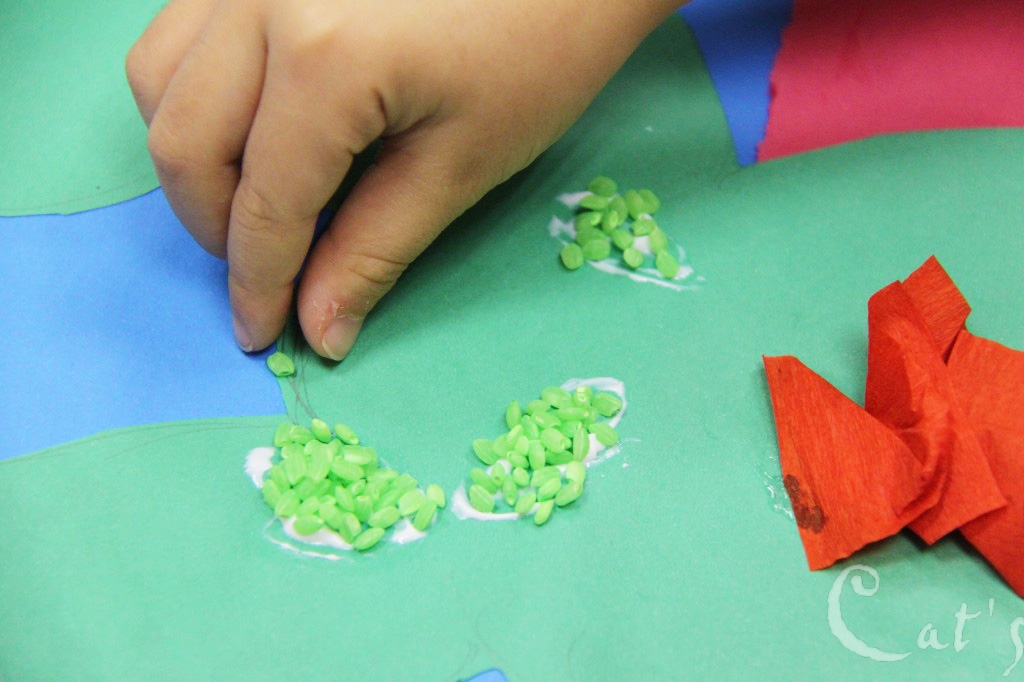 孩子們依照自己喜歡的花樣黏上米粒!有的在仙人掌黏上了一大片的米粒,也有連串在一起的小圓圈米粒!