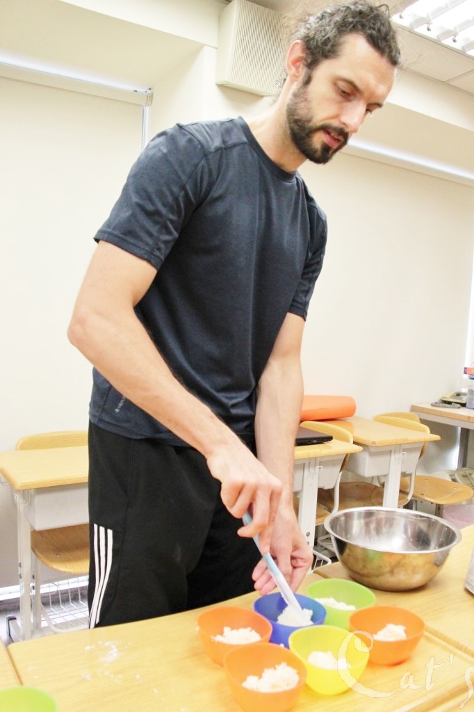 老師協助將麵團分到不同碗裡