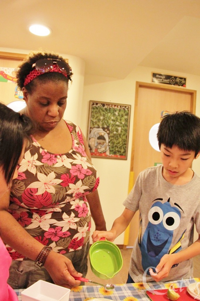 開始製作蟲蟲和泥土布丁囉!孩子們,我們要加多少水呢? That's right! 5 cups of water!
