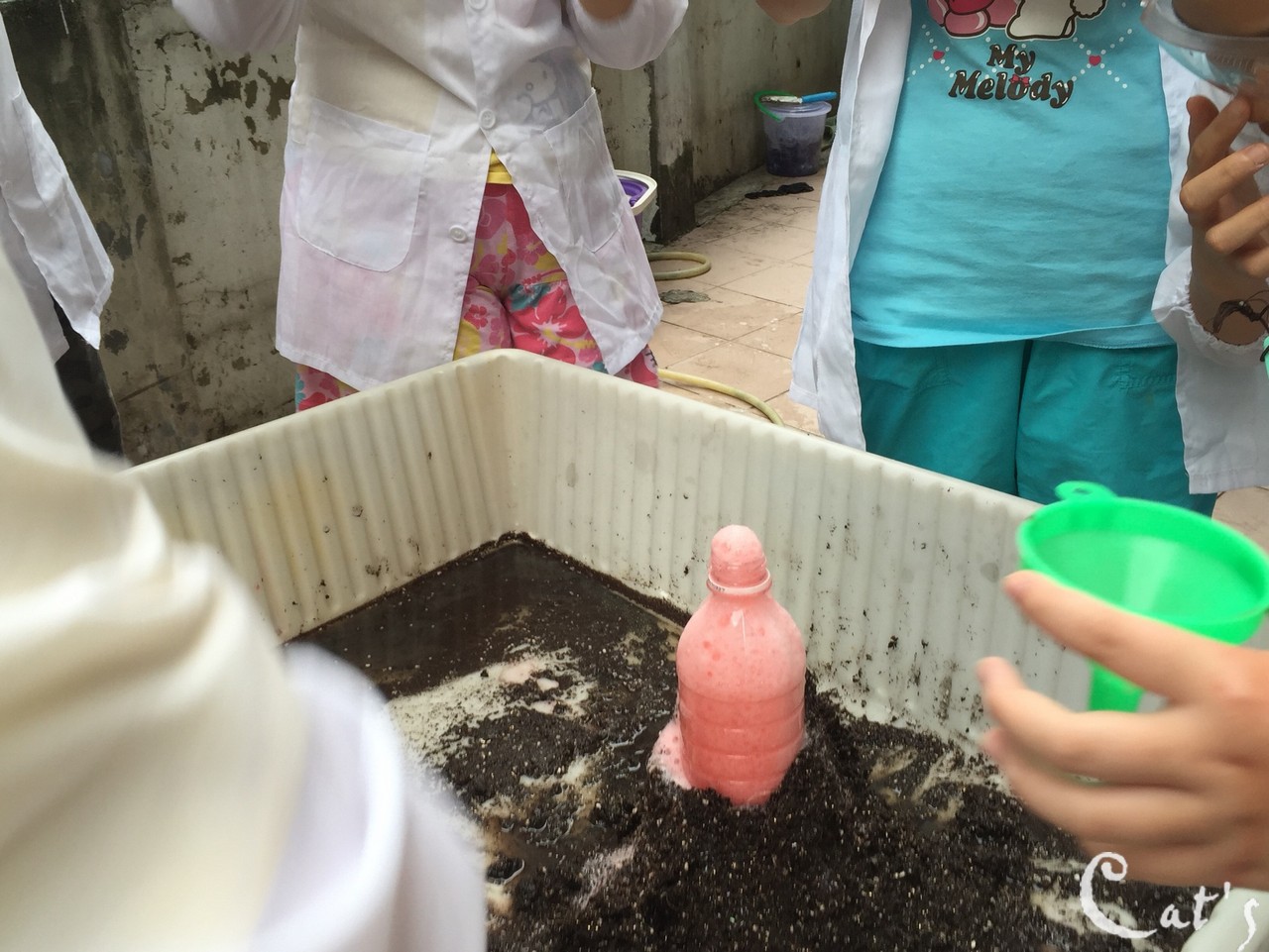 Let's cover up the bottle so it will look like a real volcano!