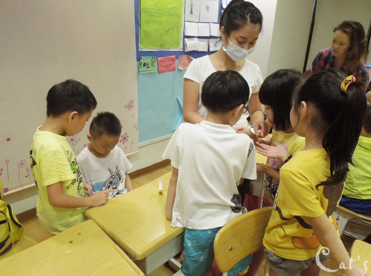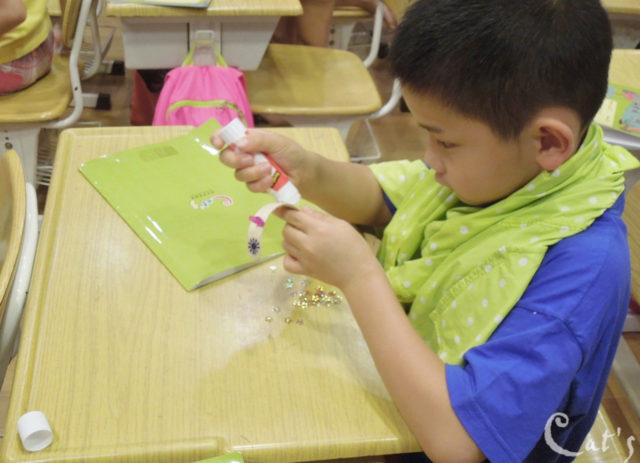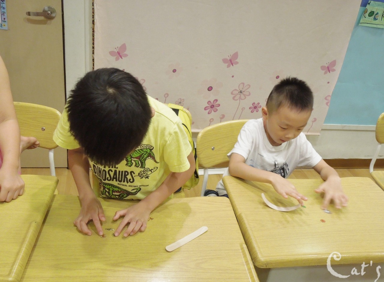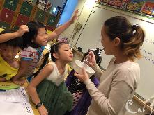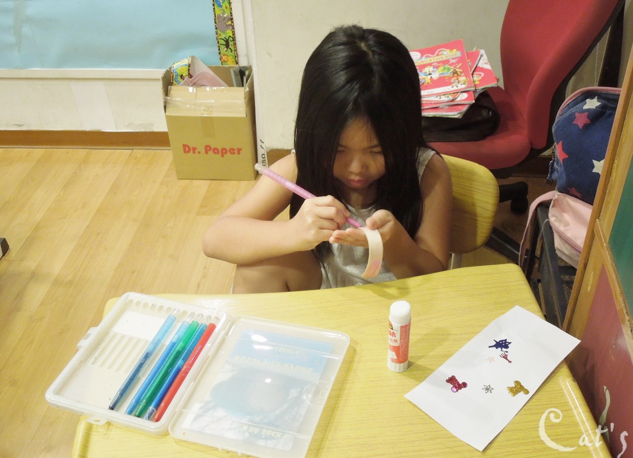 Teacher Tiffany 在發亮片讓孩子們裝飾手環