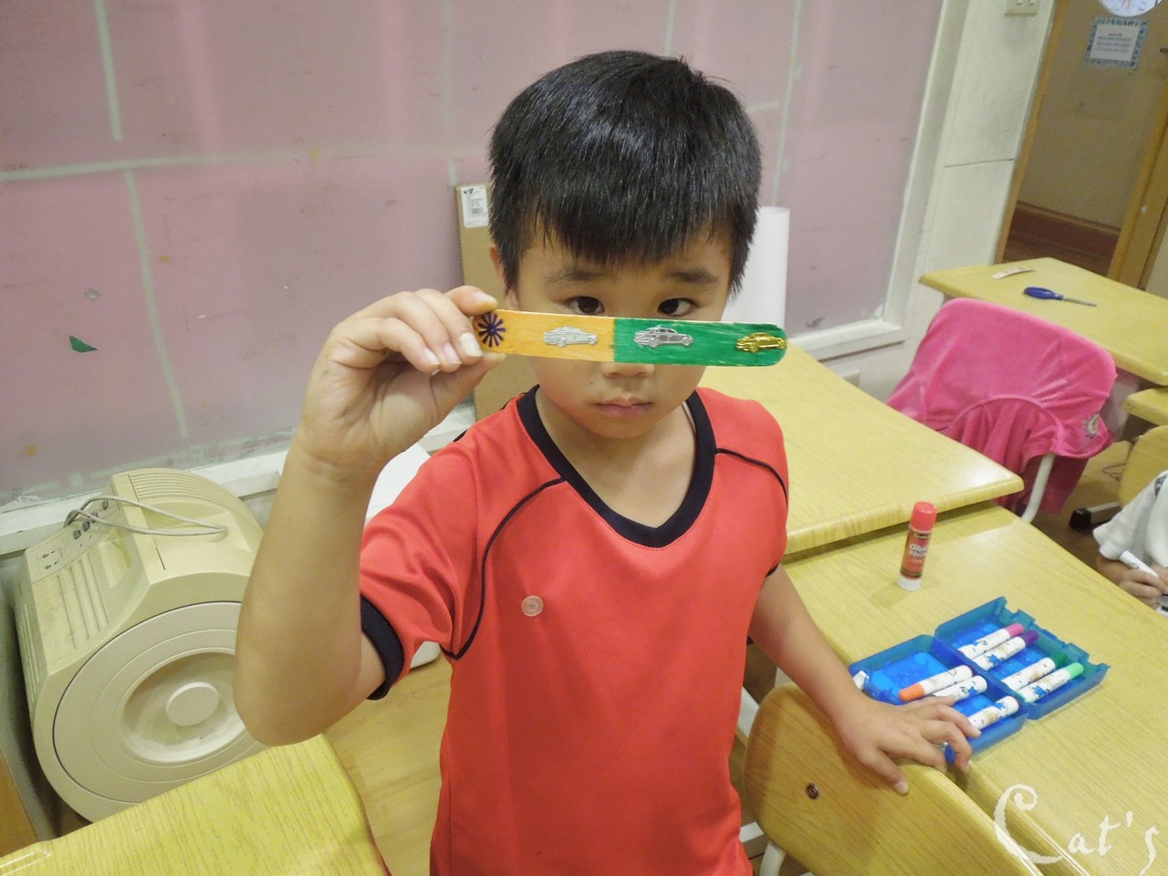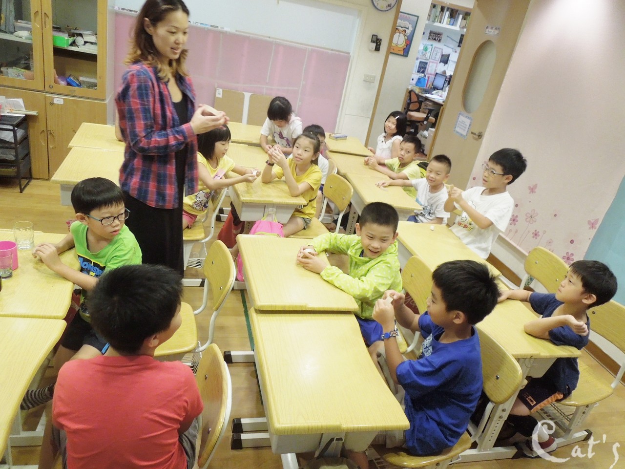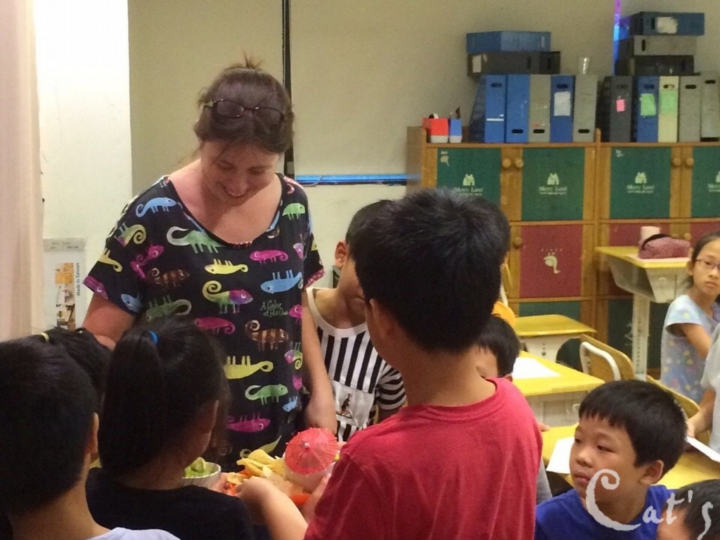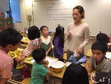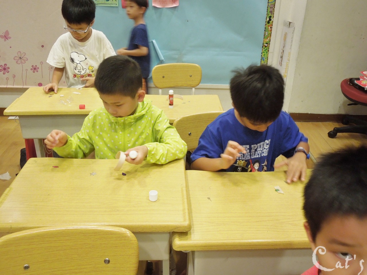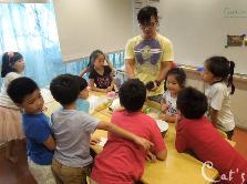 Teacher Tiffany 在發亮片讓孩子們裝飾手環