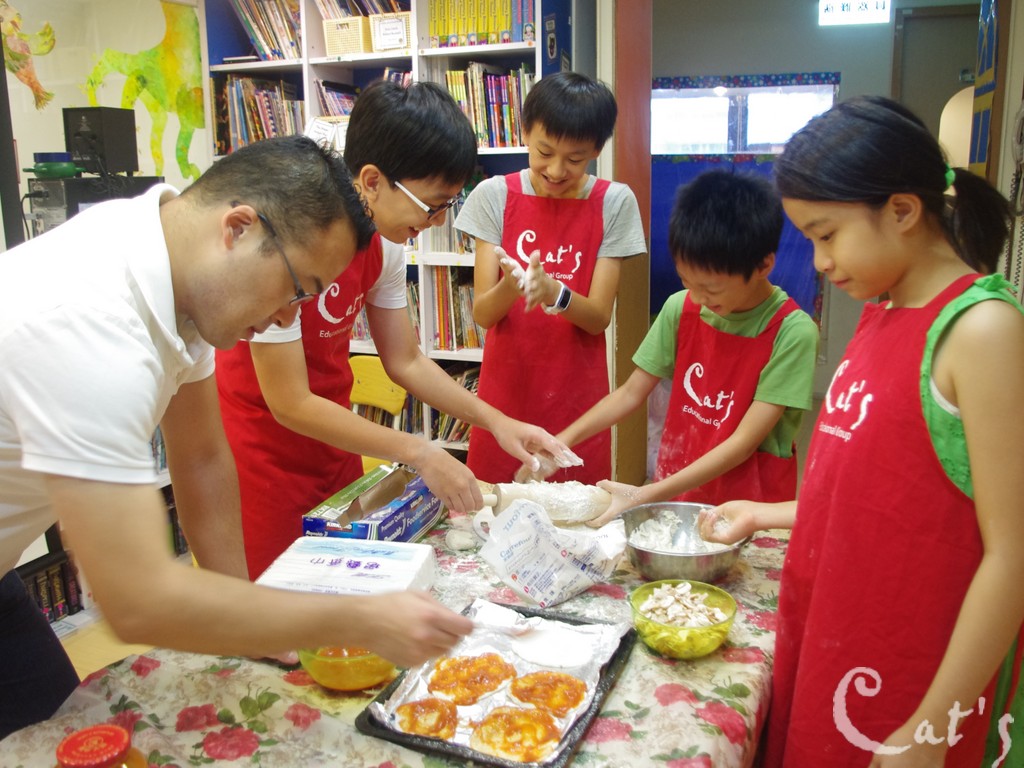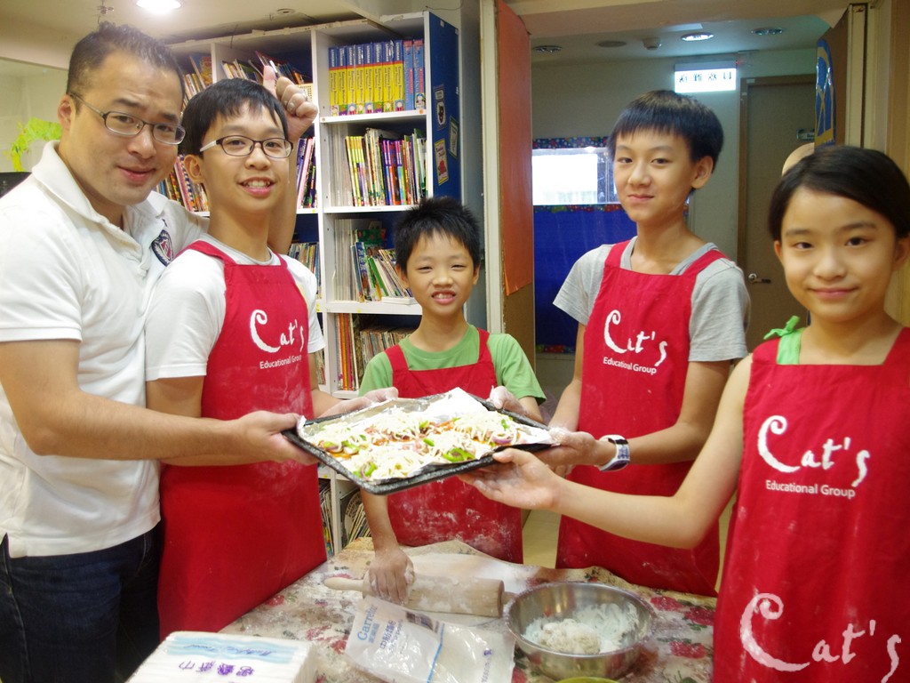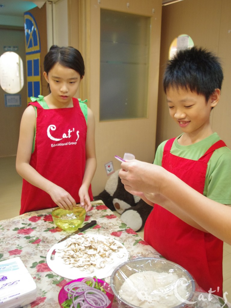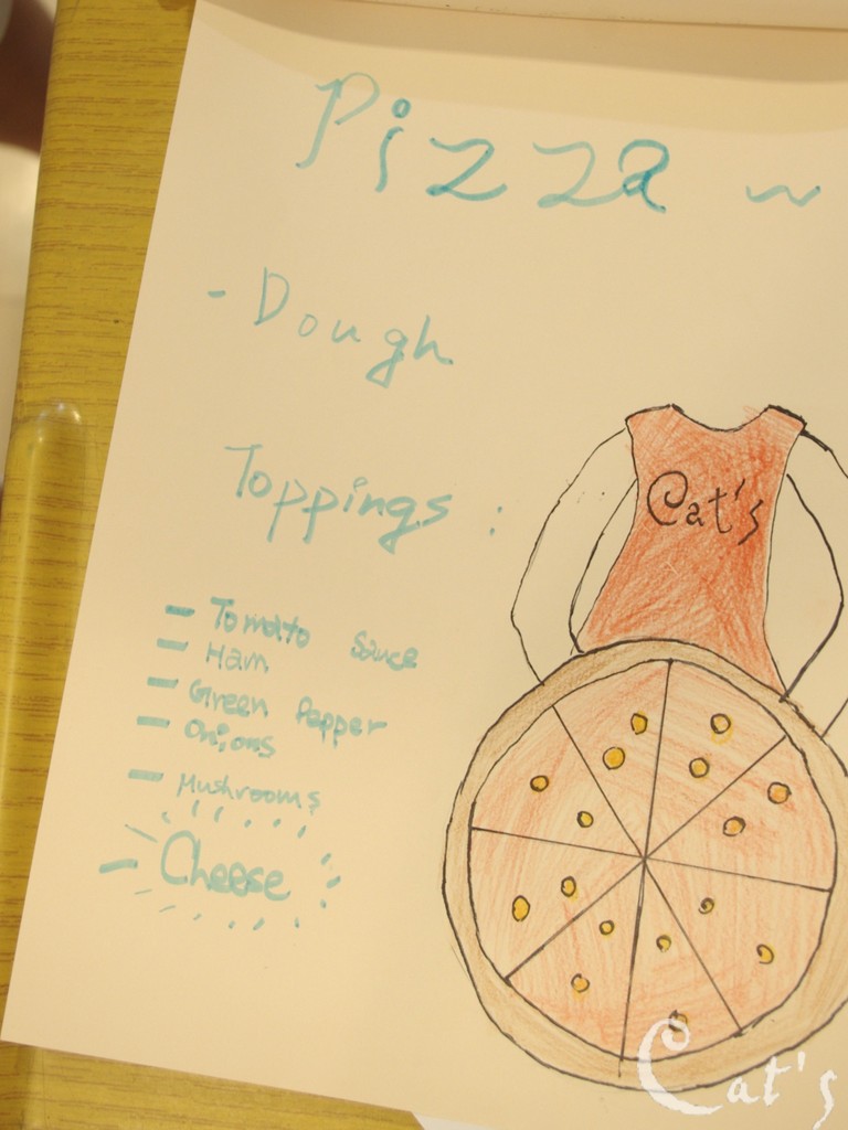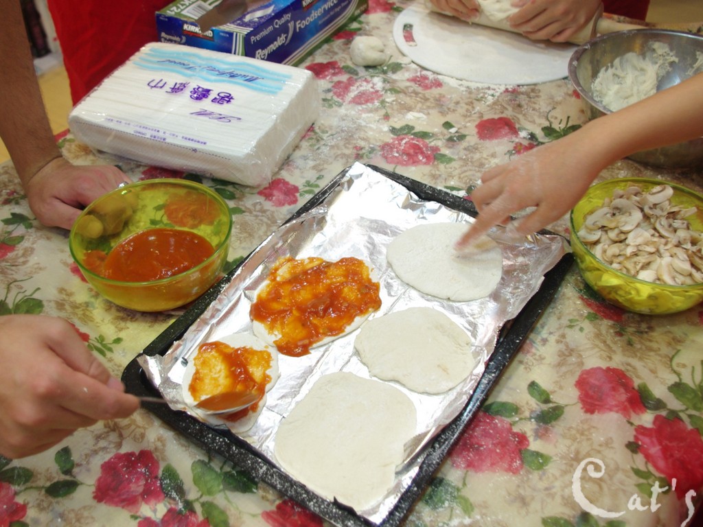 T. Alex認真地點綴著即將放入烤箱的pizza!