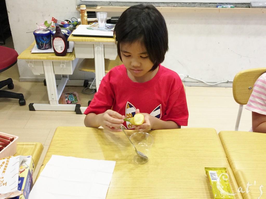 Ting Ting將壓好的檸檬汁慢慢倒入碗中