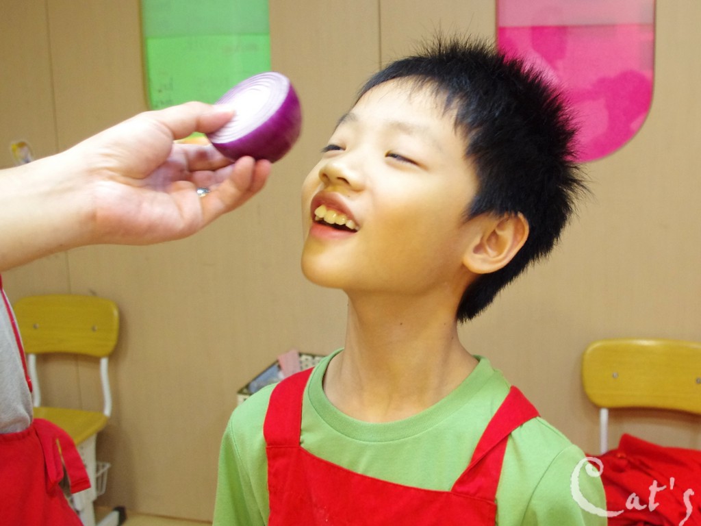 很努力的試著搗碎洋蔥片!