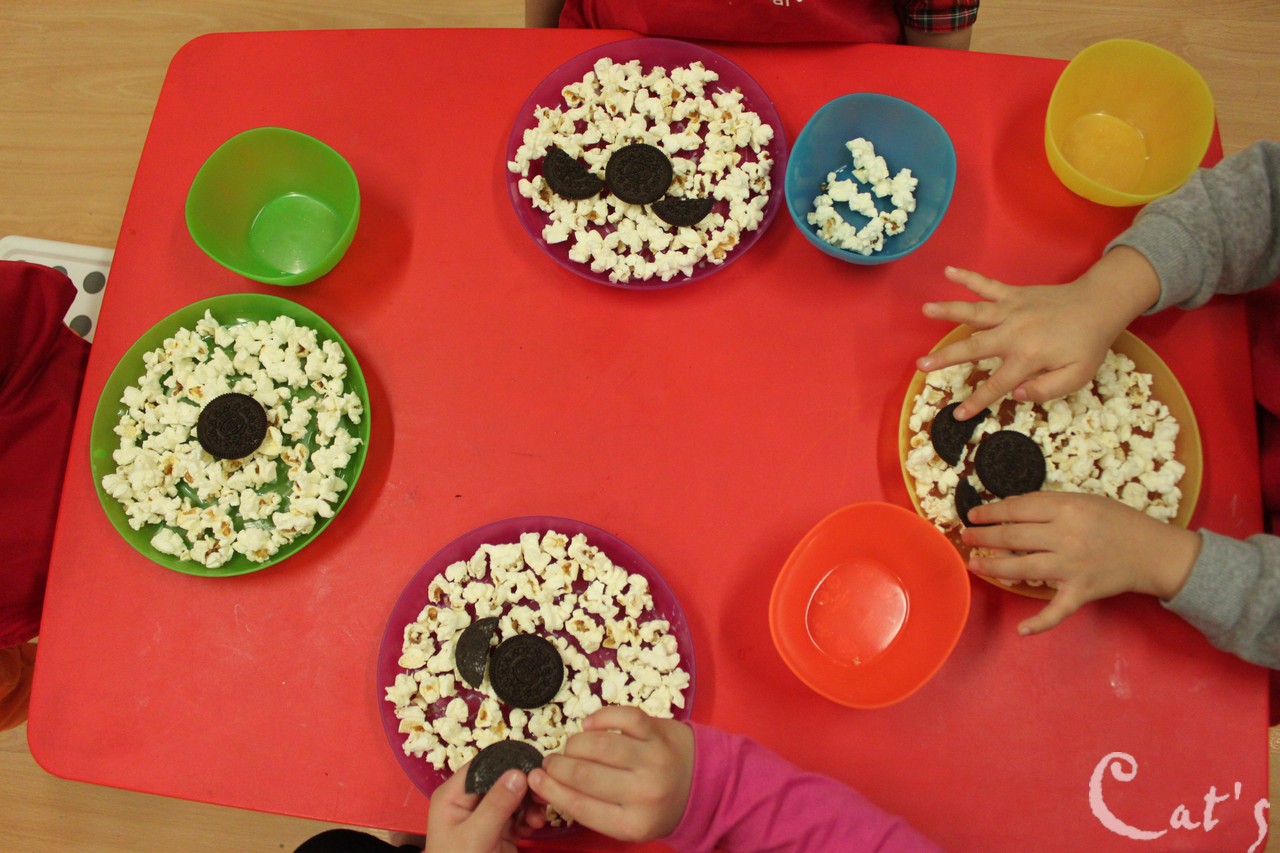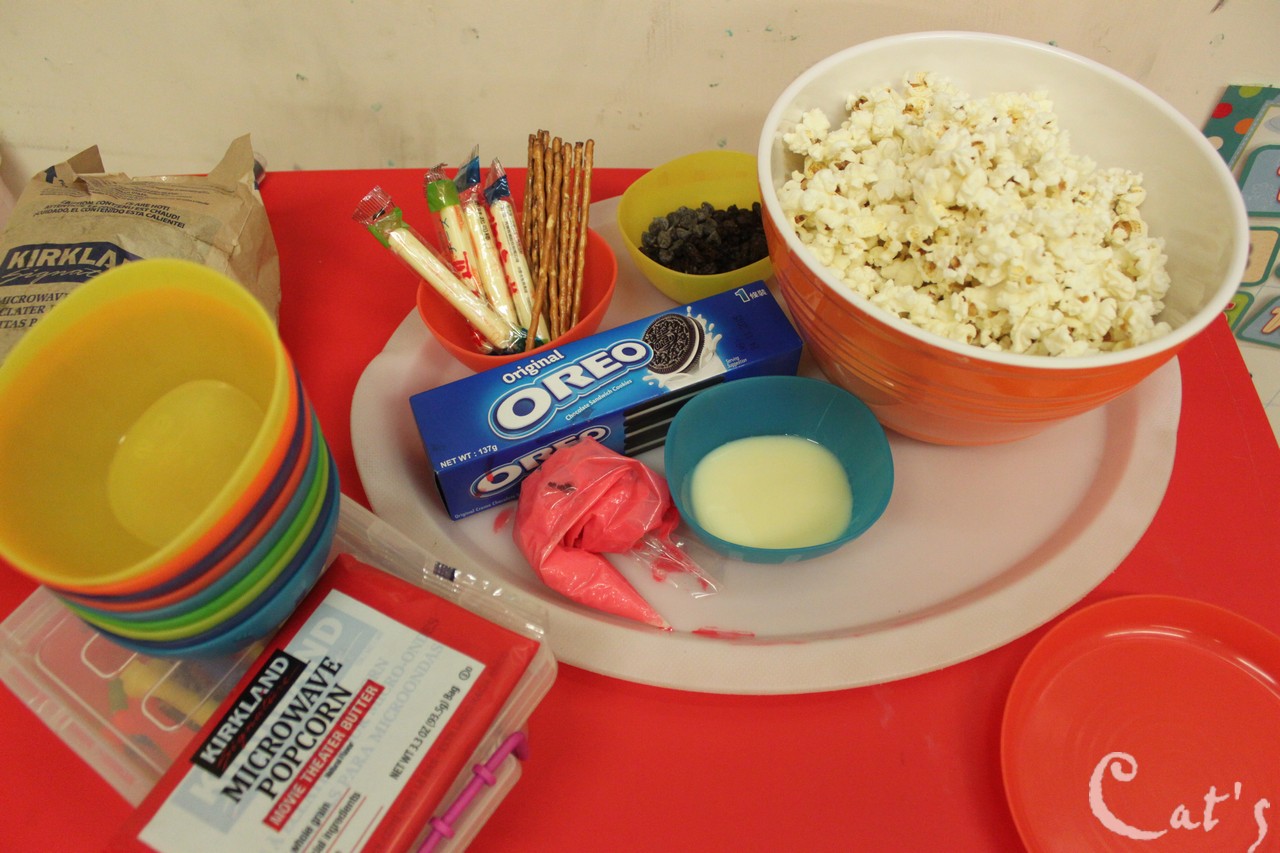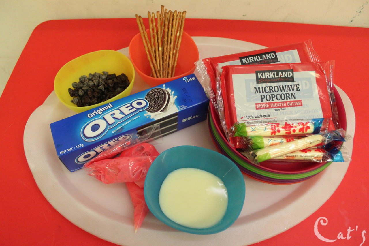 popcorn sheep 爆米花(羊毛身體) oreo(臉) 起司(眼睛) 巧克力豆(眼珠) 棒狀餅乾(腿) 葡萄乾(腳)