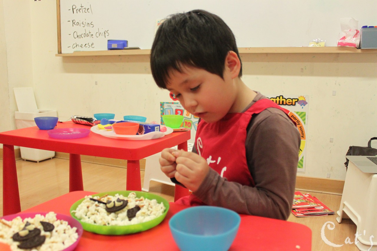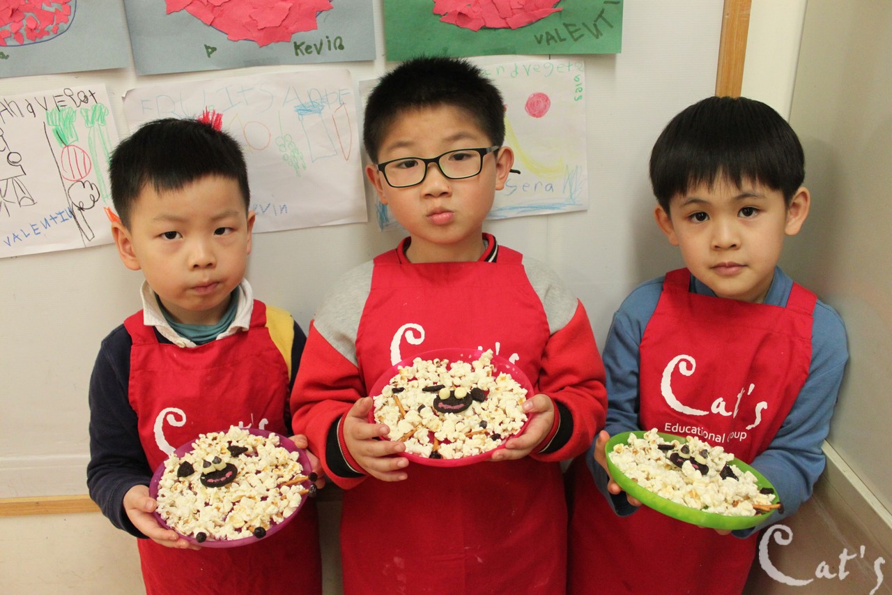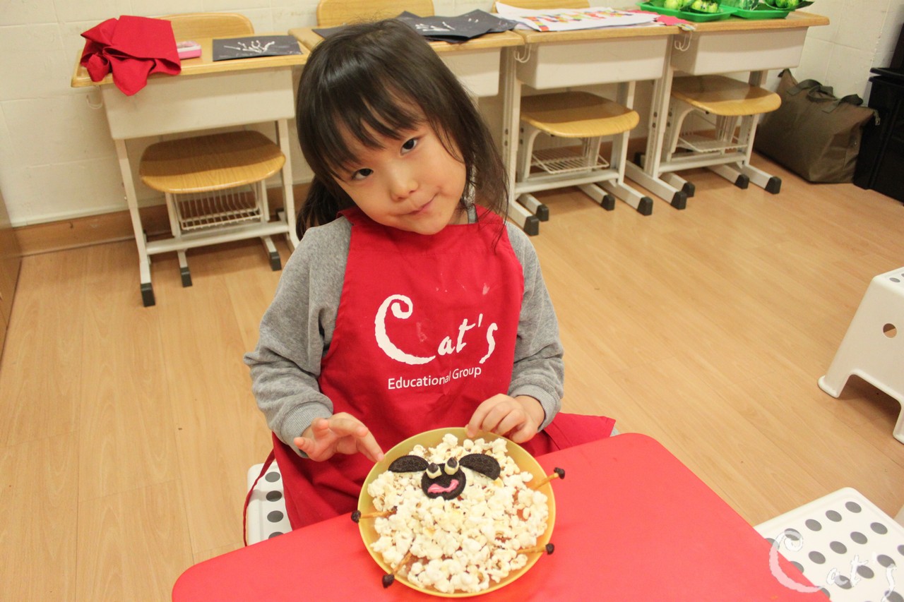 popcorn sheep 爆米花(羊毛身體) oreo(臉) 起司(眼睛) 巧克力豆(眼珠) 棒狀餅乾(腿) 葡萄乾(腳)