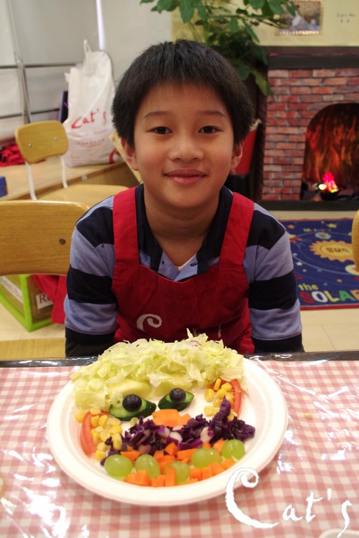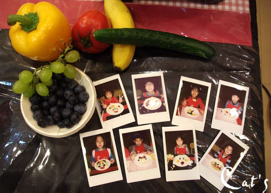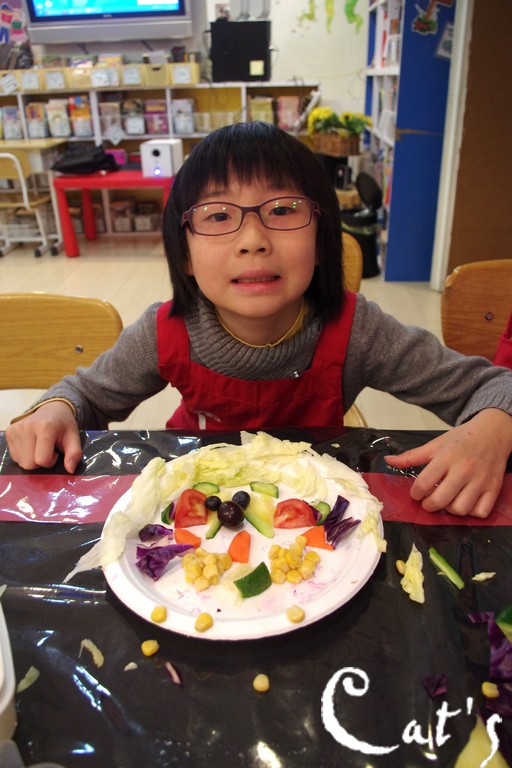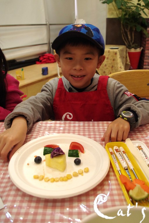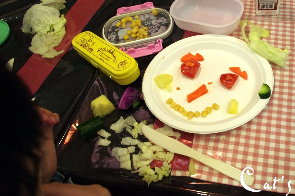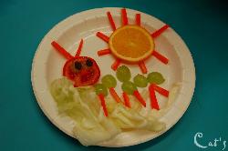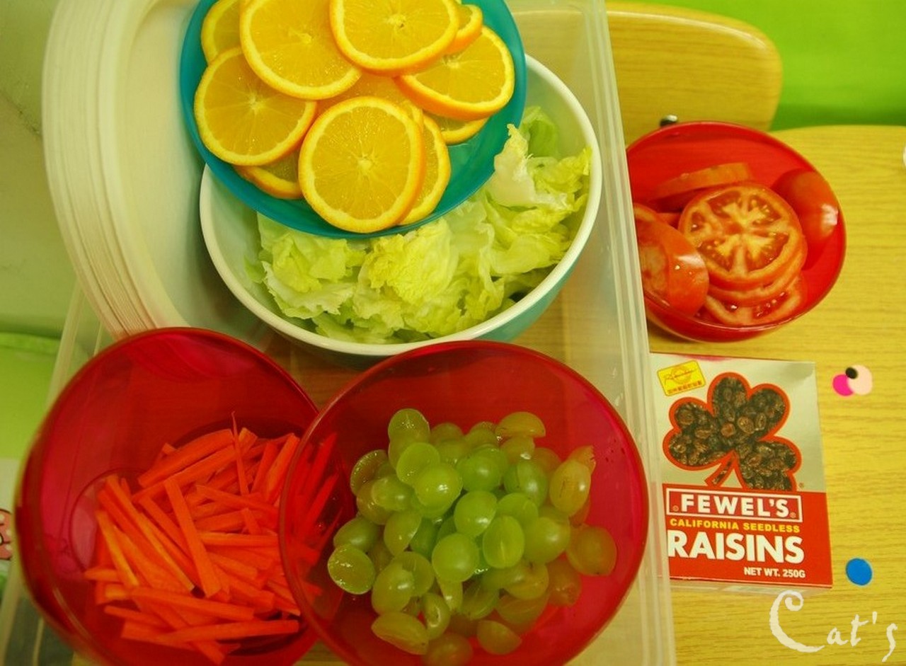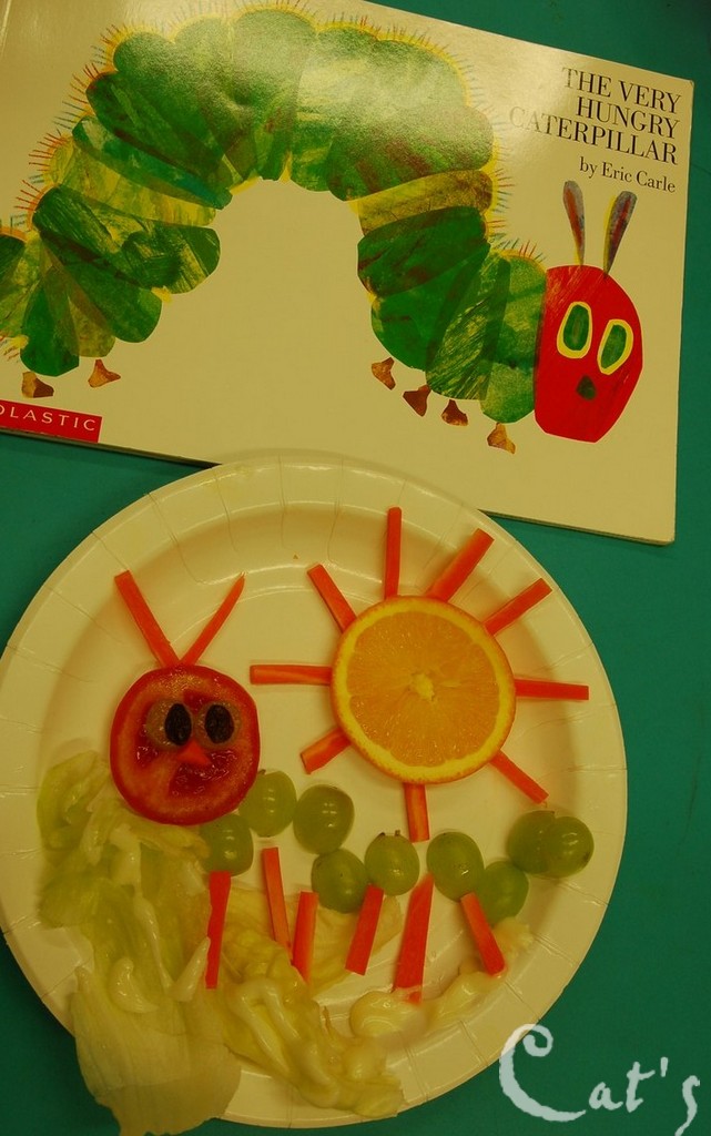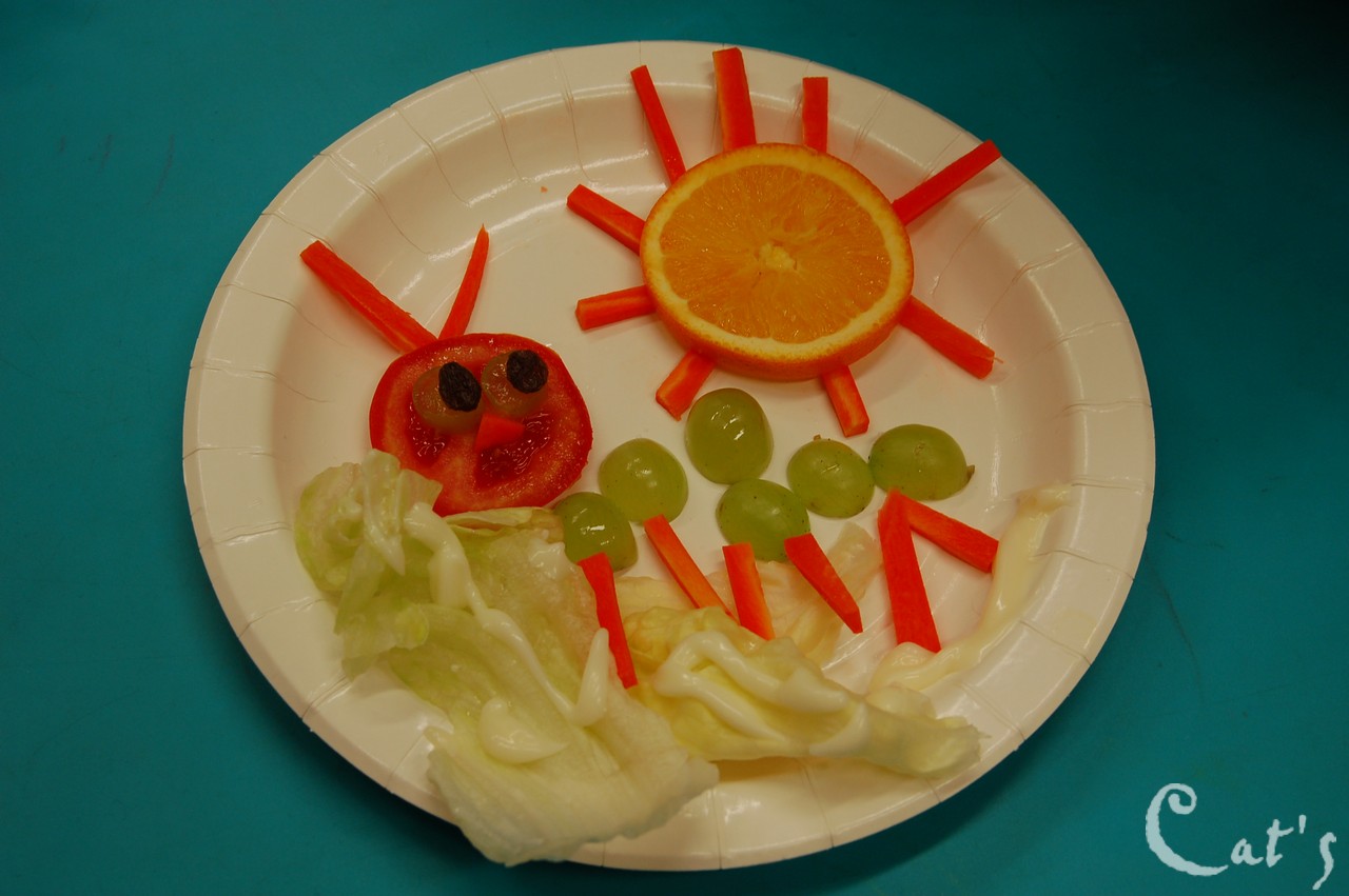 材料: 番茄(臉) 柳丁(太陽) 紅蘿蔔(太陽跟觸角跟腳) 葡萄(毛毛蟲身體) 生菜(草) 葡萄乾(眼睛)