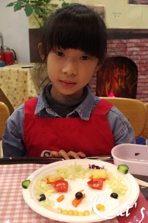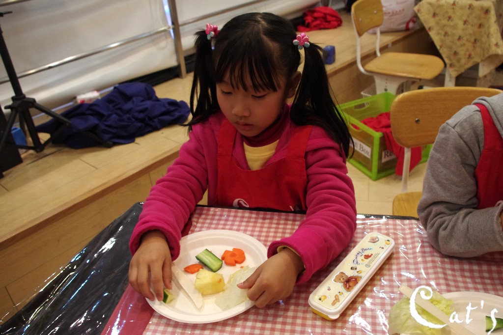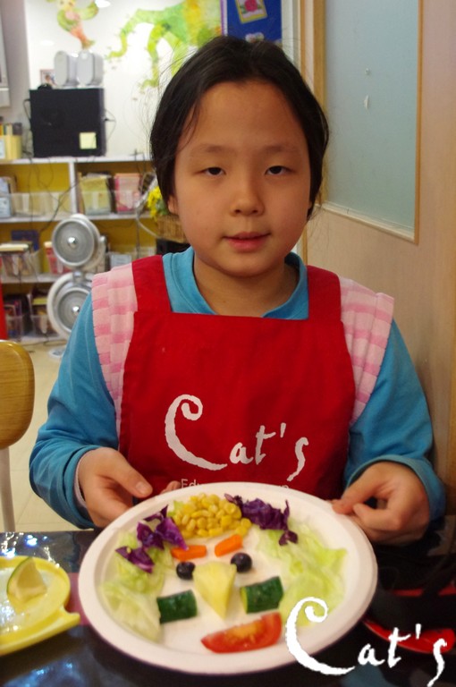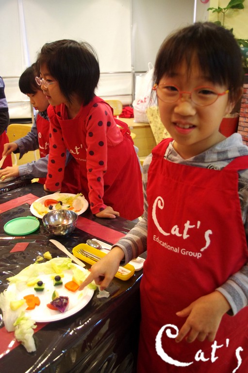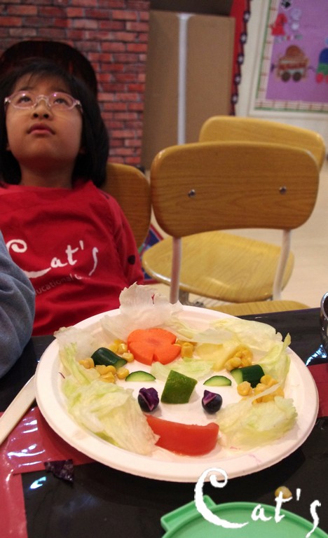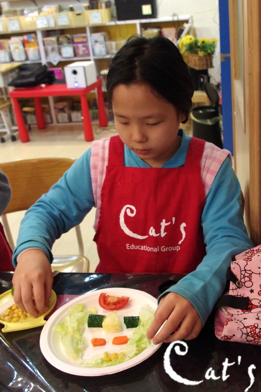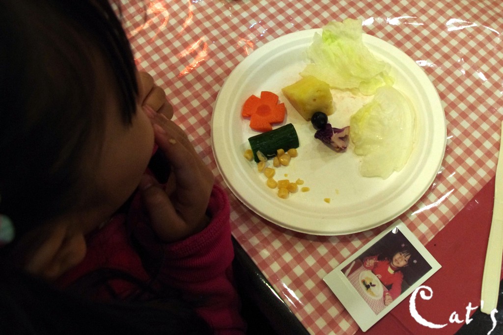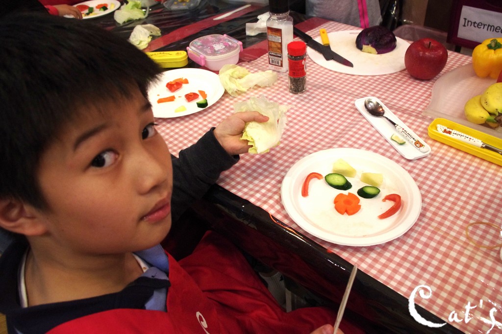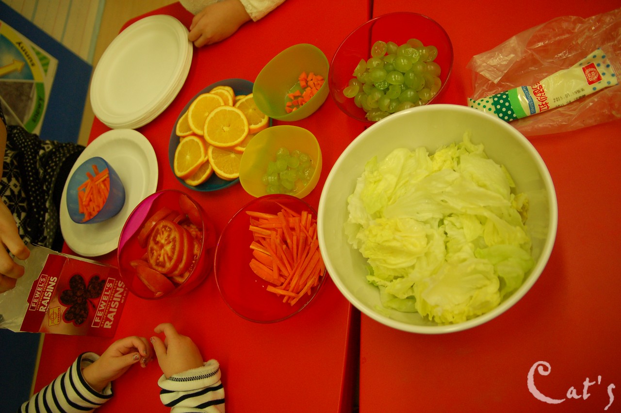 材料: 番茄(臉) 柳丁(太陽) 紅蘿蔔(太陽跟觸角跟腳) 葡萄(毛毛蟲身體) 生菜(草) 葡萄乾(眼睛)