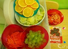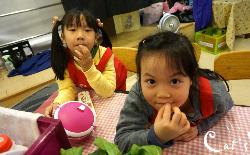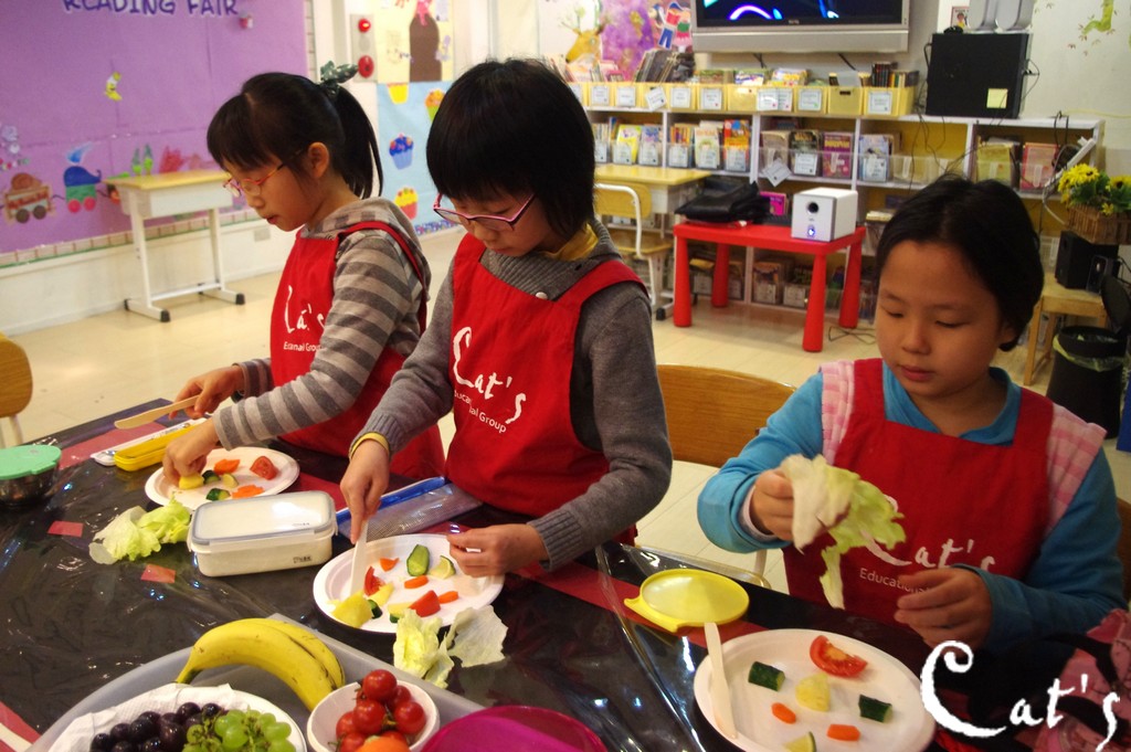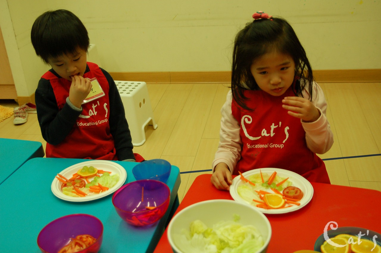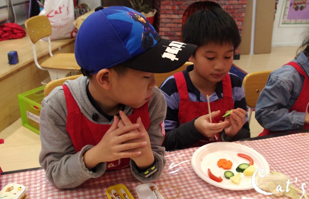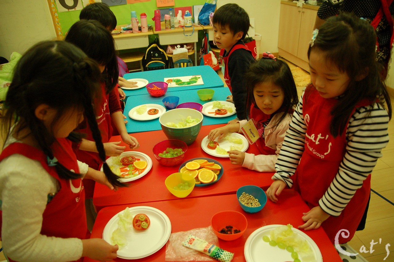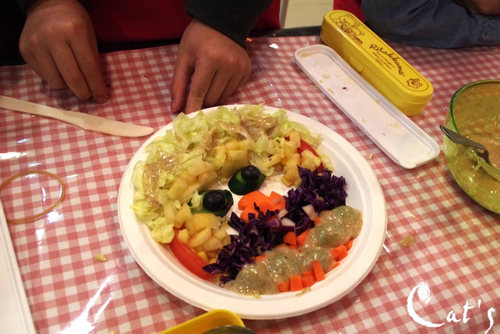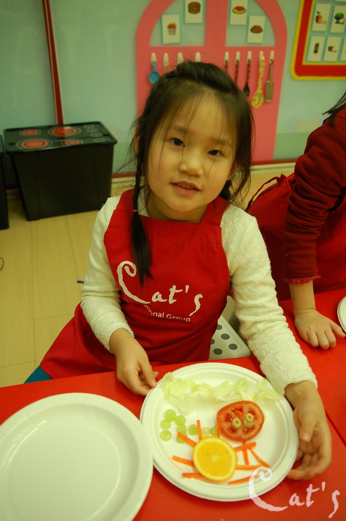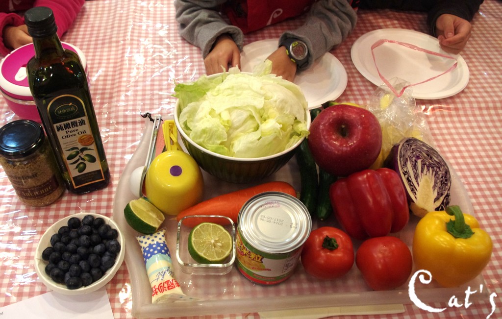 材料: 番茄(臉) 柳丁(太陽) 紅蘿蔔(太陽跟觸角跟腳) 葡萄(毛毛蟲身體) 生菜(草) 葡萄乾(眼睛)