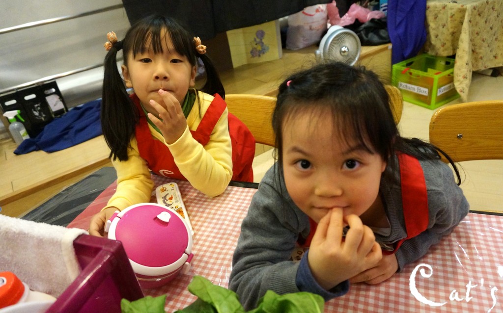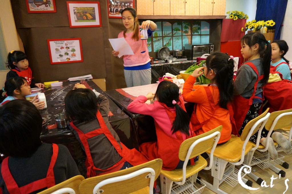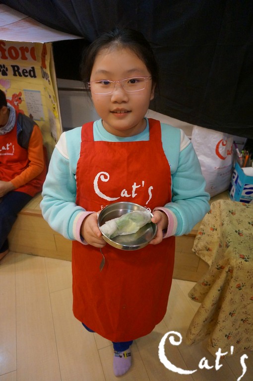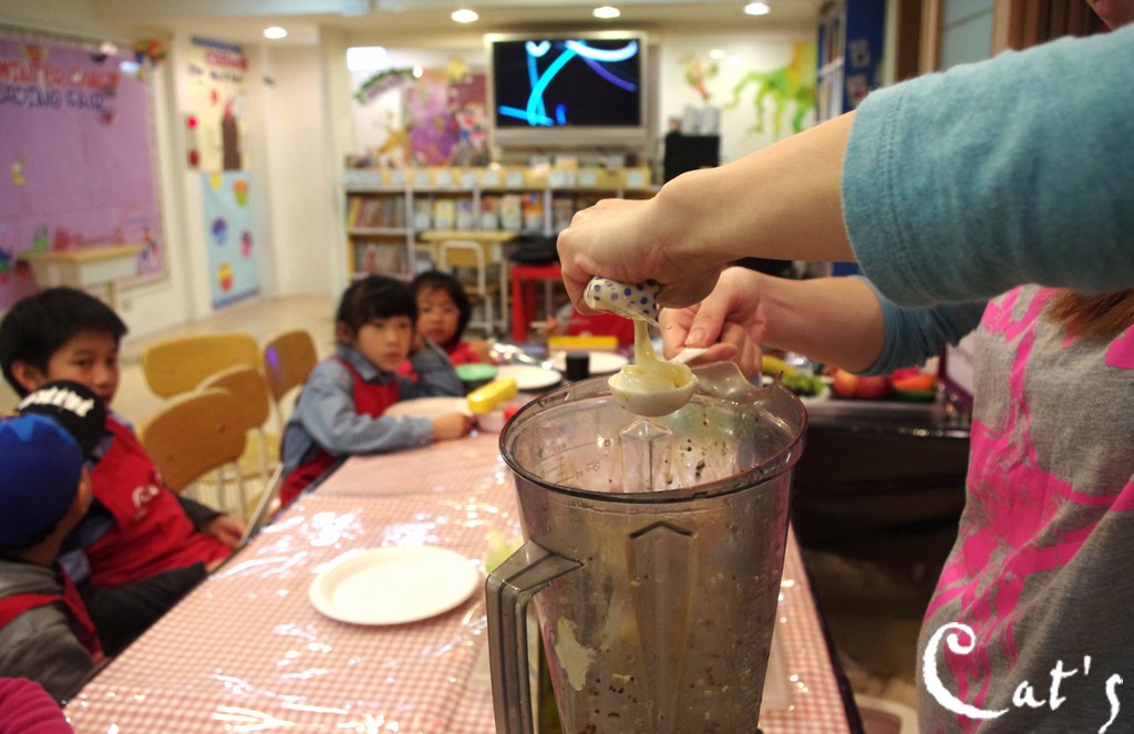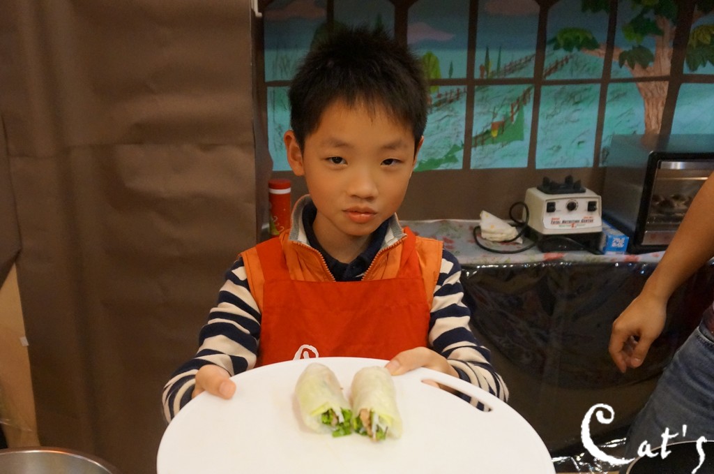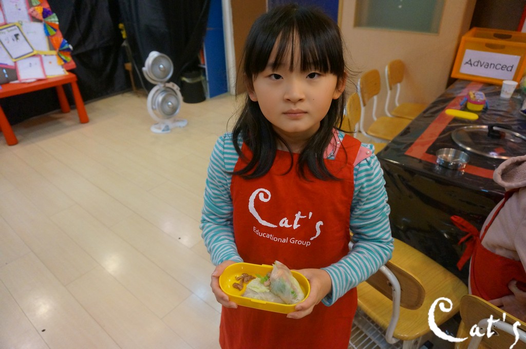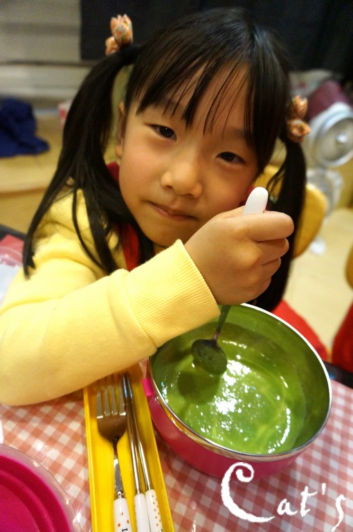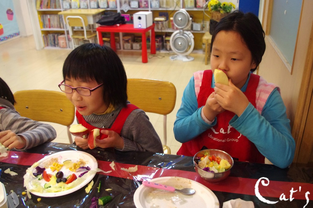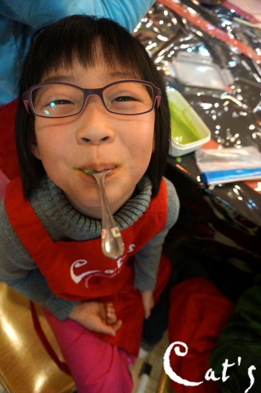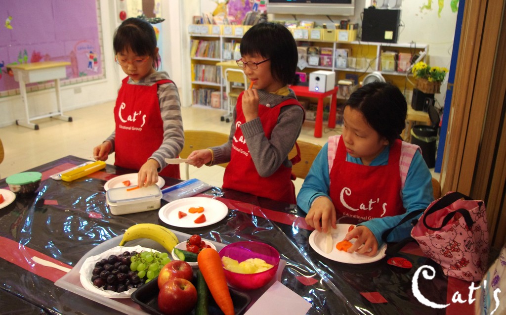 材料: 番茄(臉) 柳丁(太陽) 紅蘿蔔(太陽跟觸角跟腳) 葡萄(毛毛蟲身體) 生菜(草) 葡萄乾(眼睛)