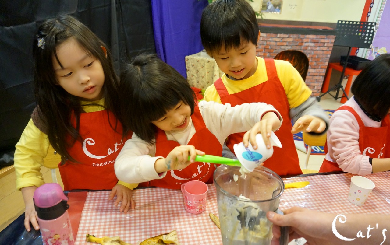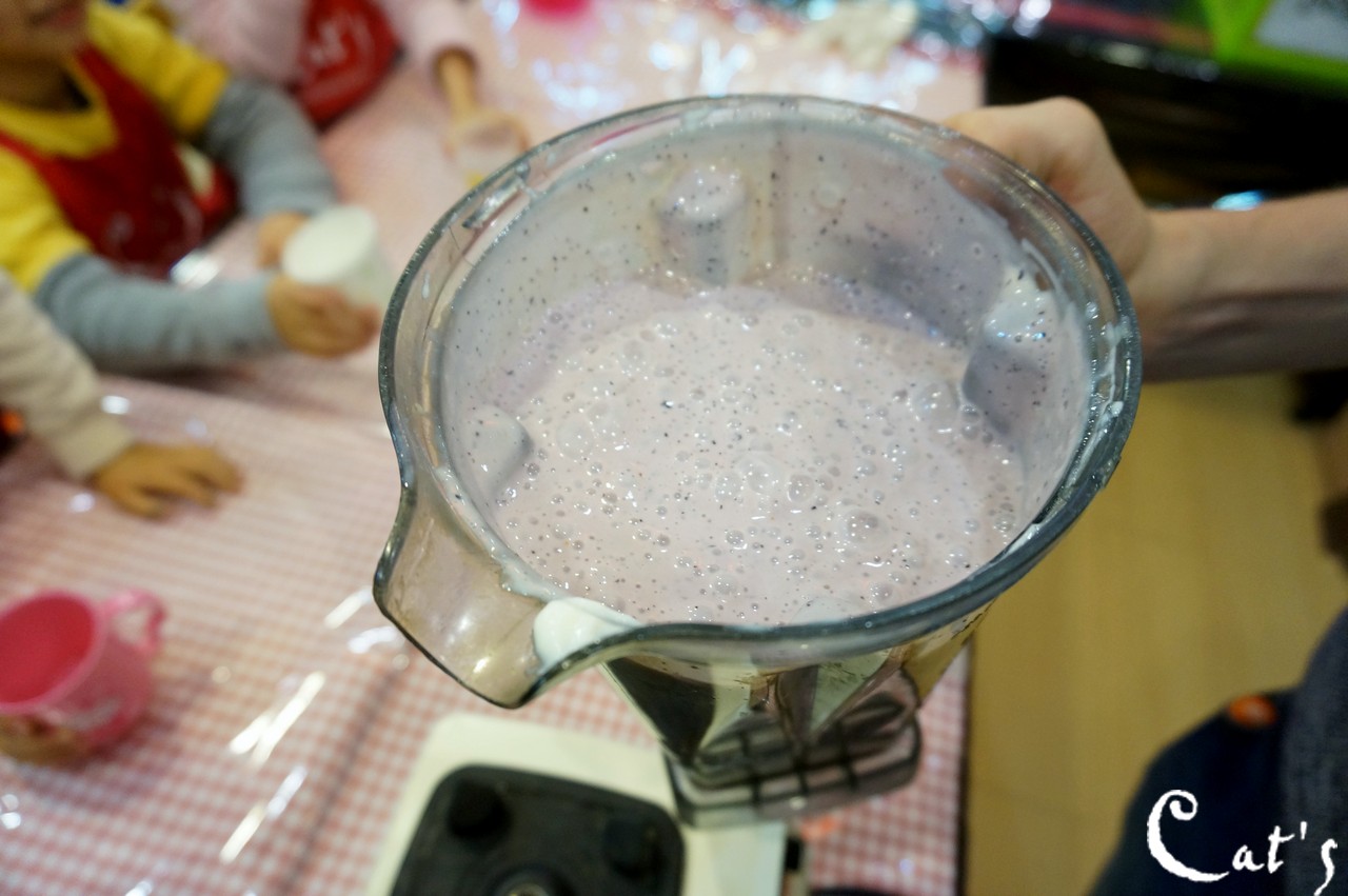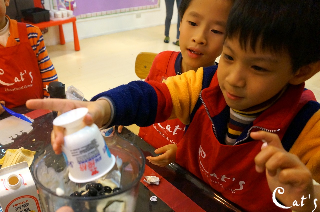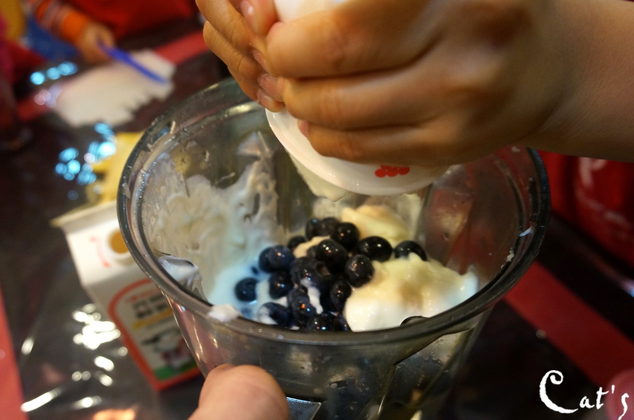 Benny, Sophie and A-bi pouring yoghurt into the blender~