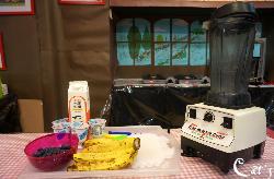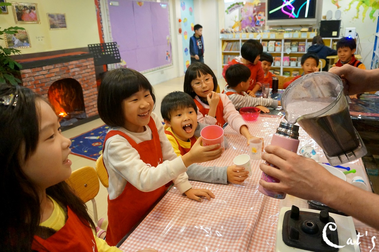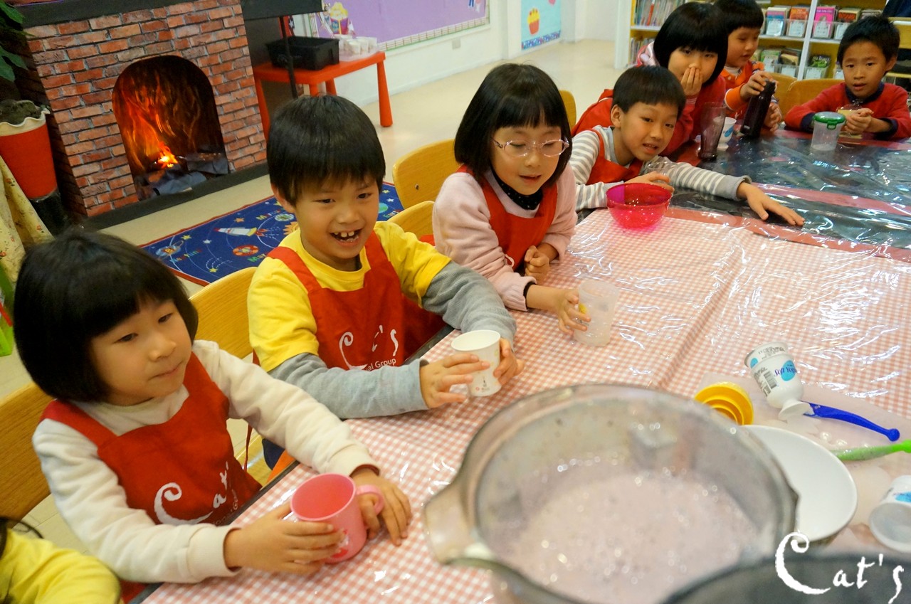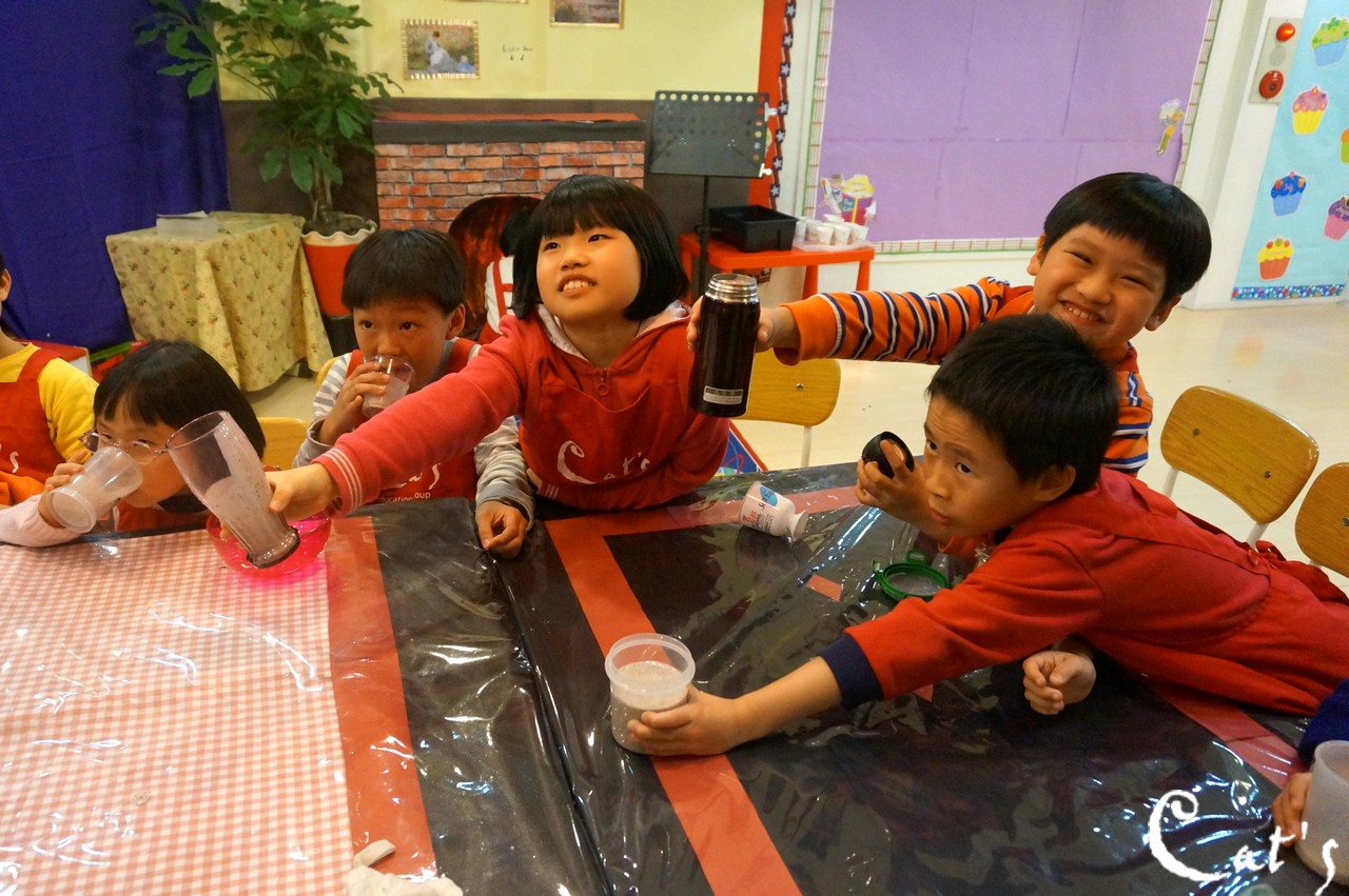 Benny, Sophie and A-bi pouring yoghurt into the blender~