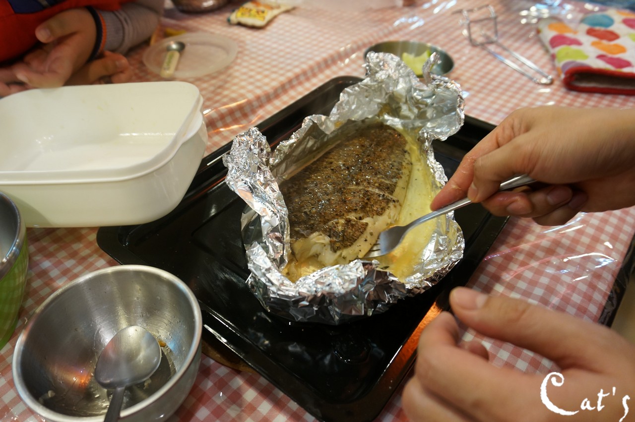 Lily waiting for the baked fish to serve!