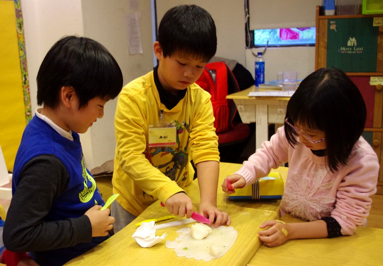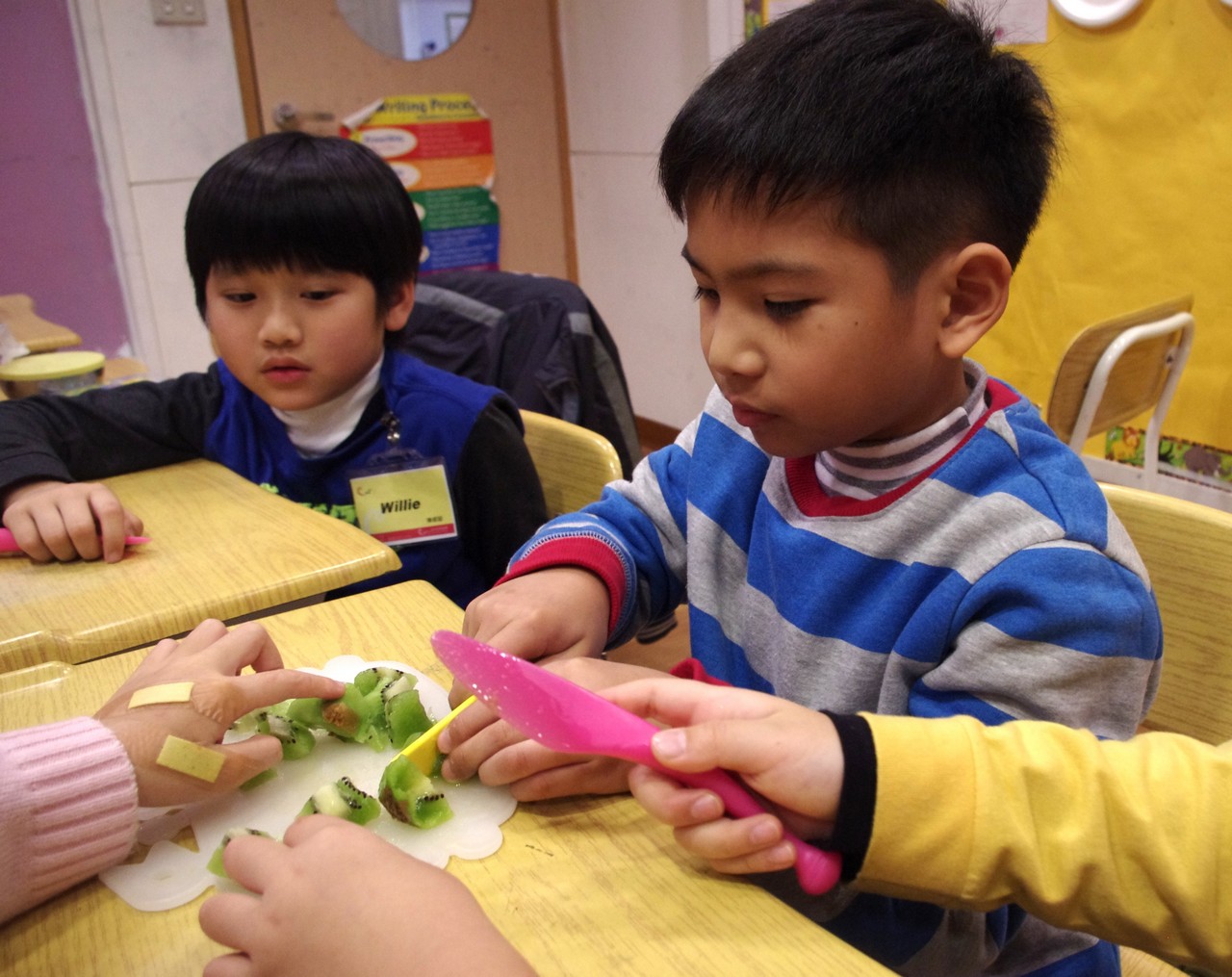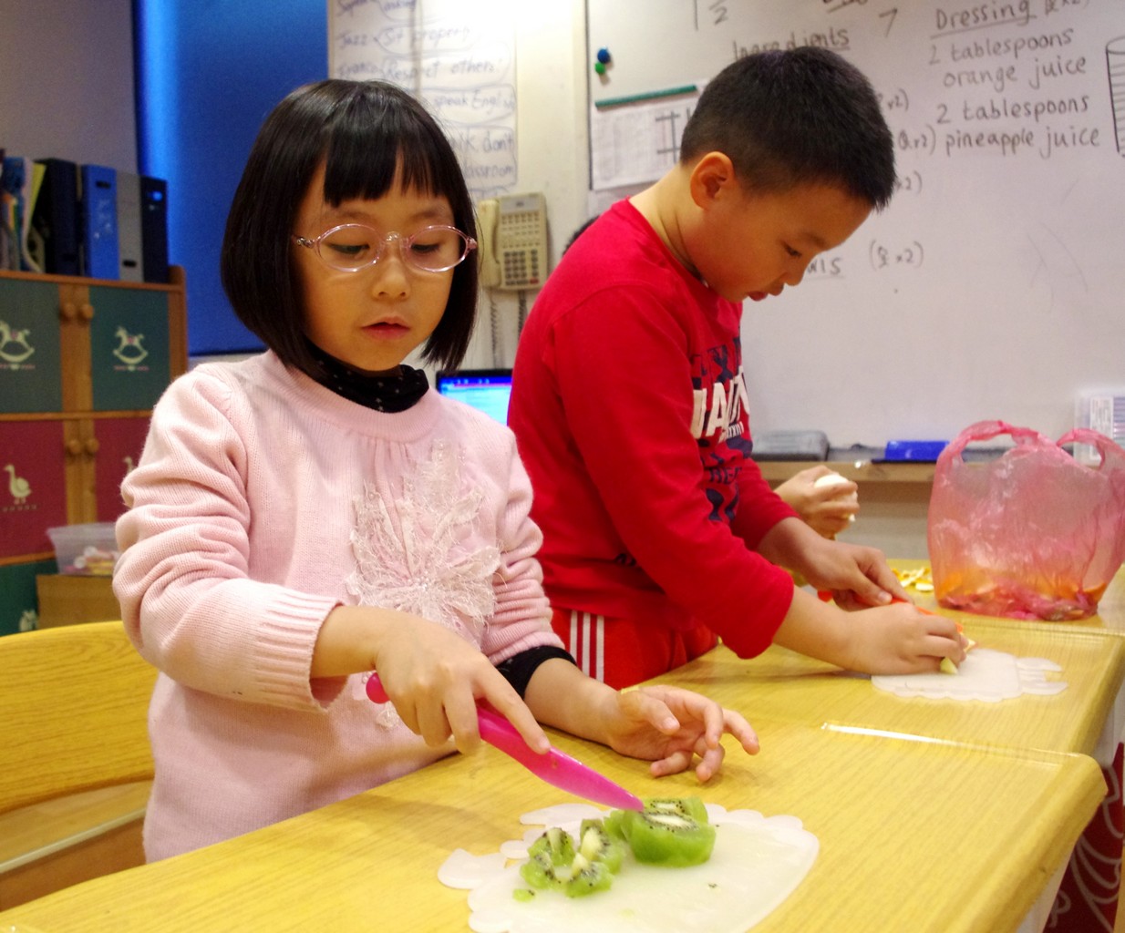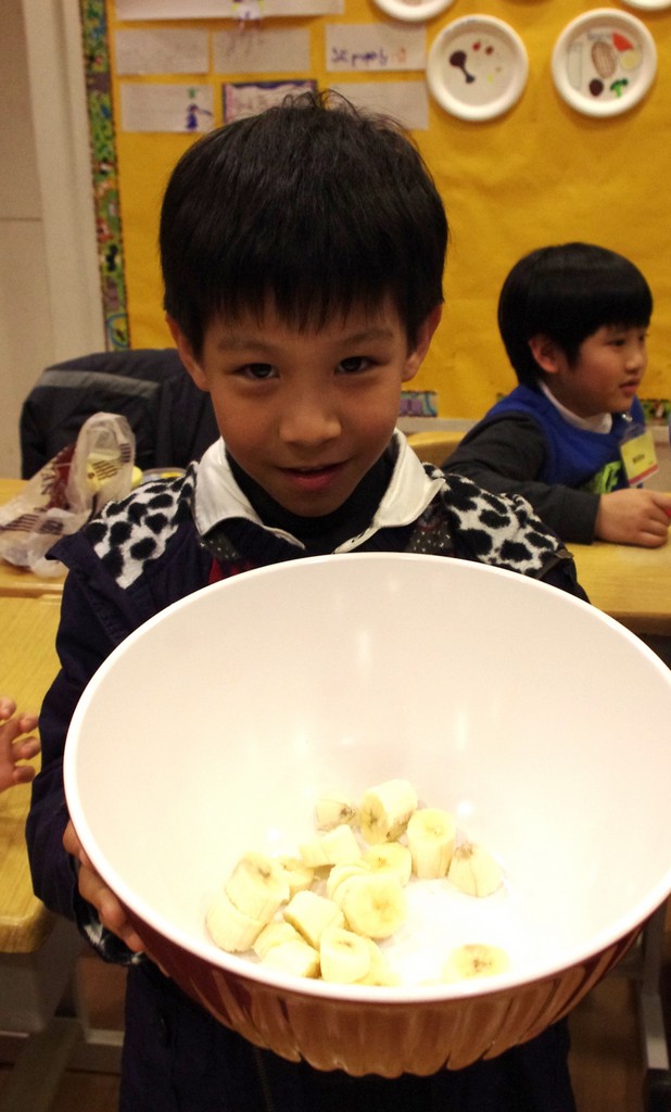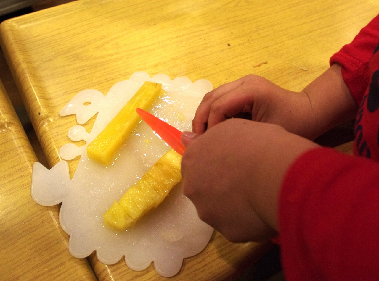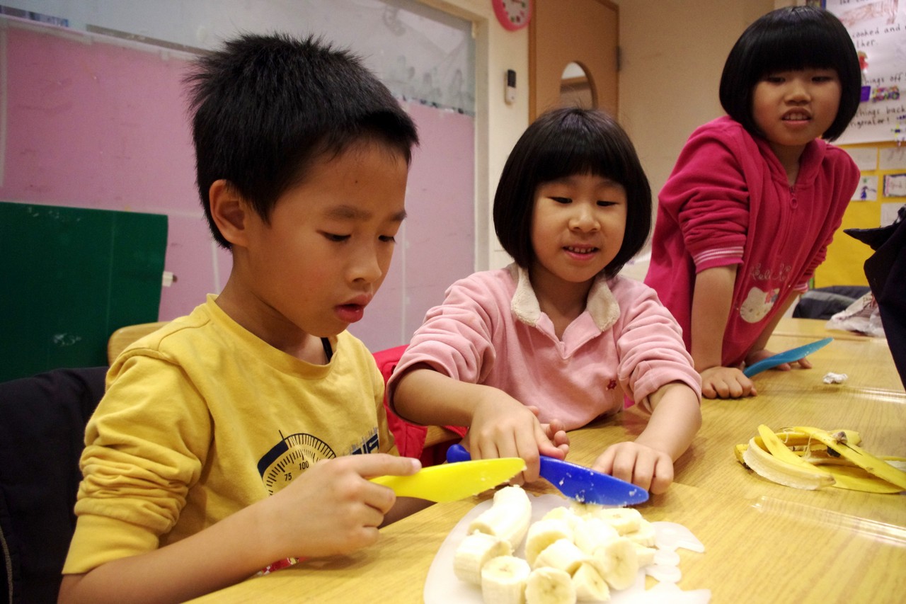Jazz, Sophie and Kitty taking turns to cut bananas