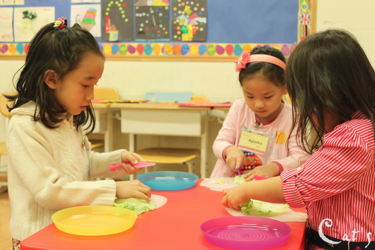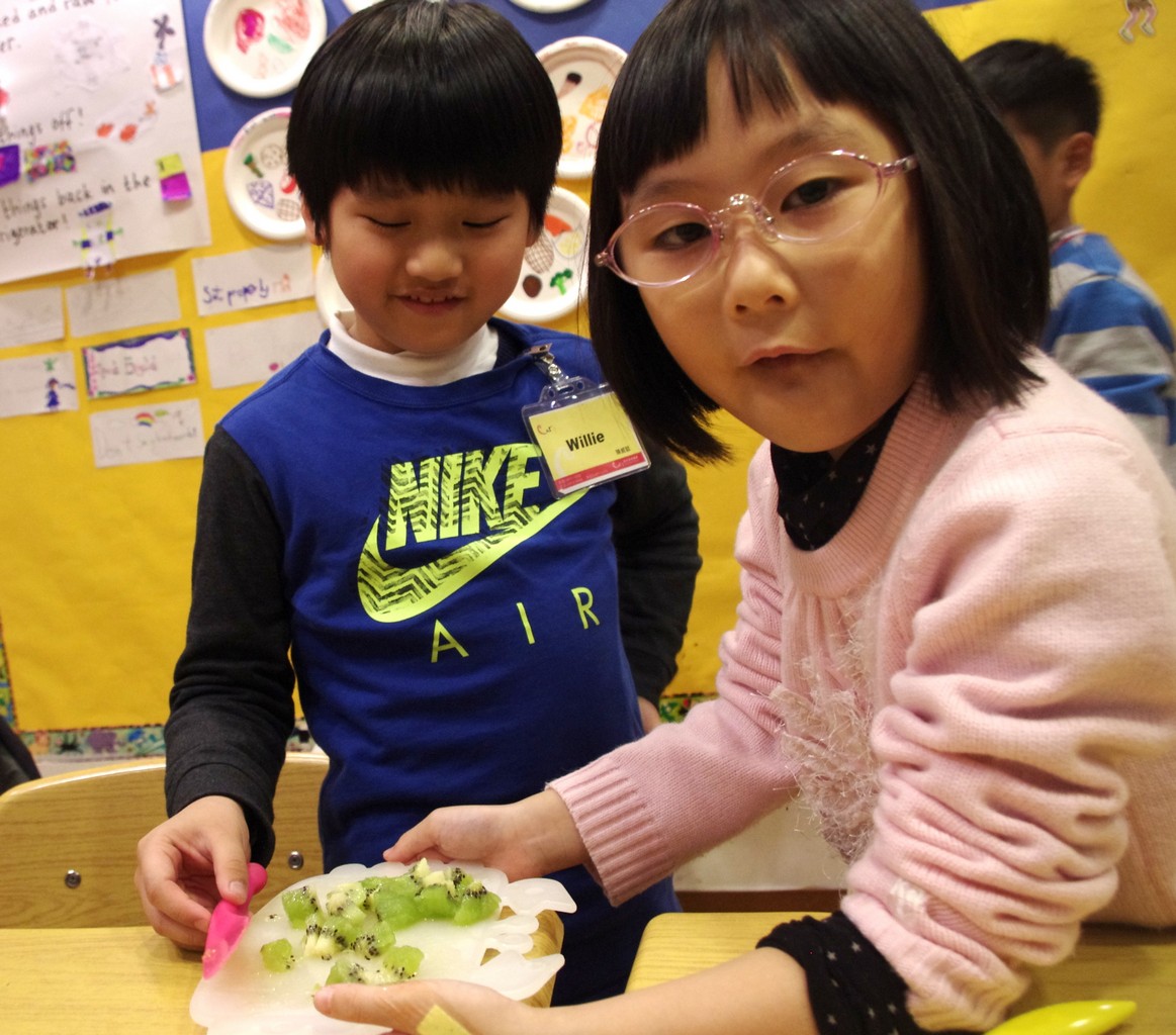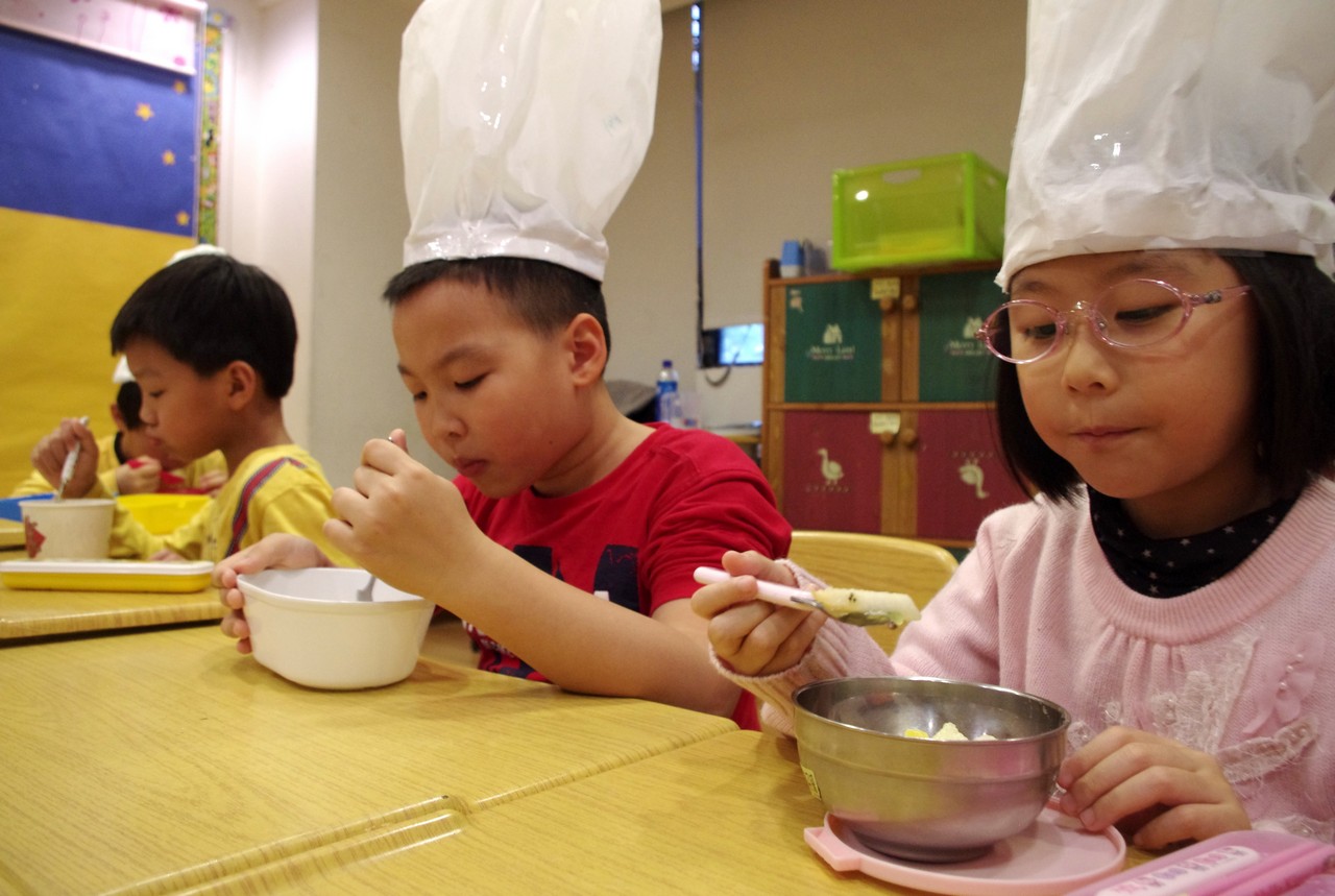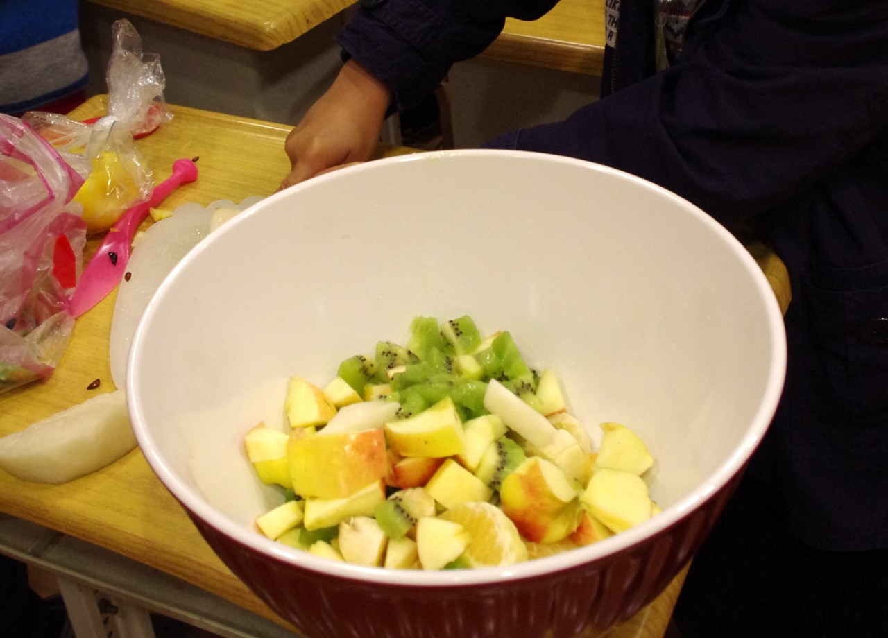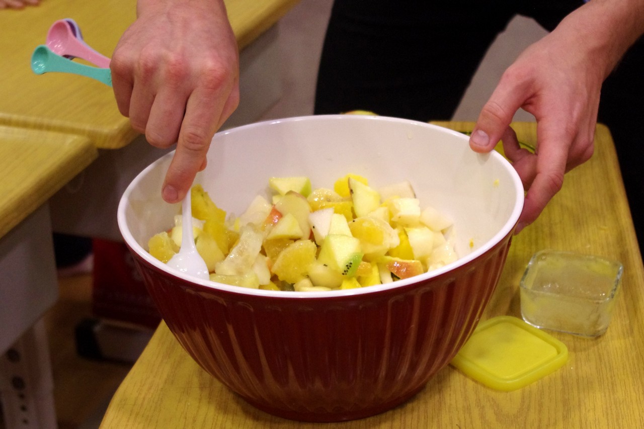 Jazz, Sophie and Kitty taking turns to cut bananas