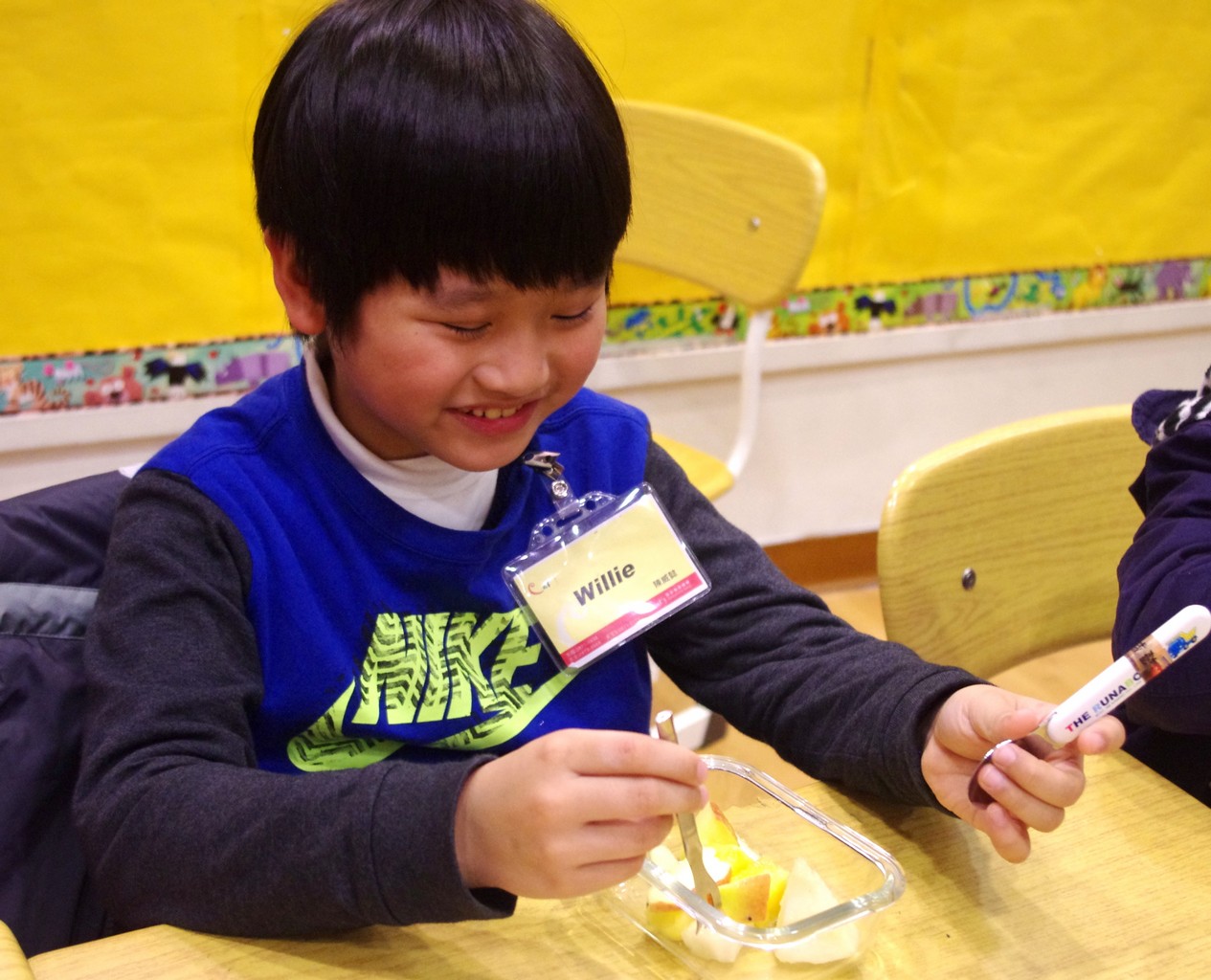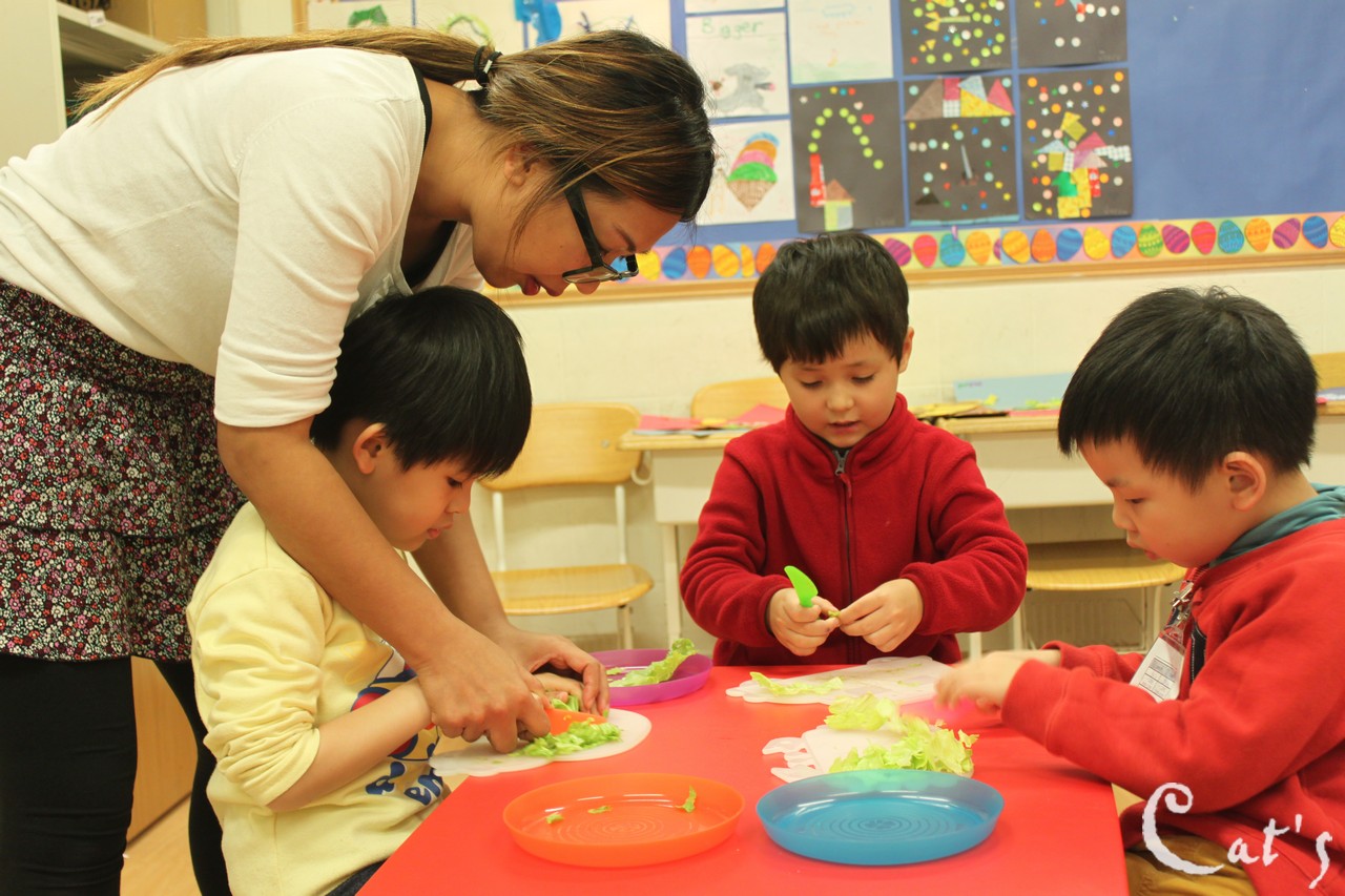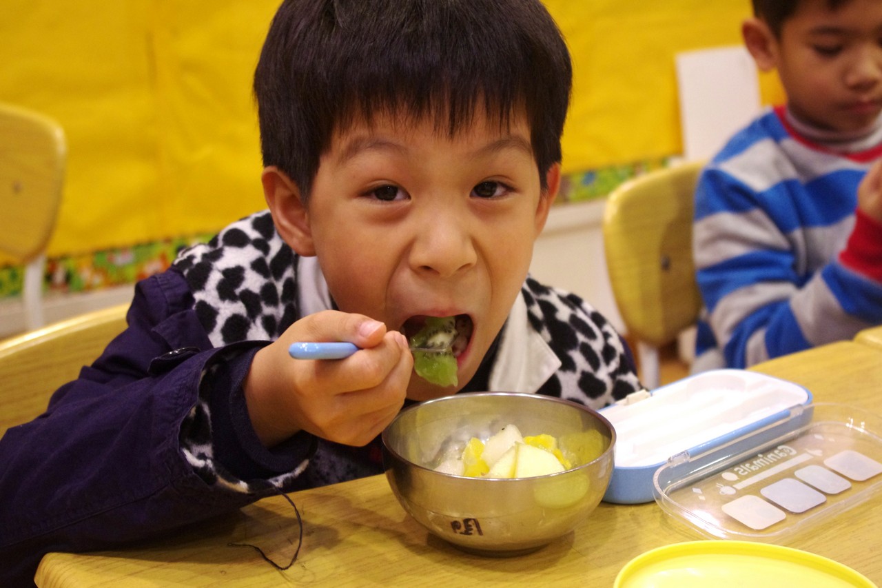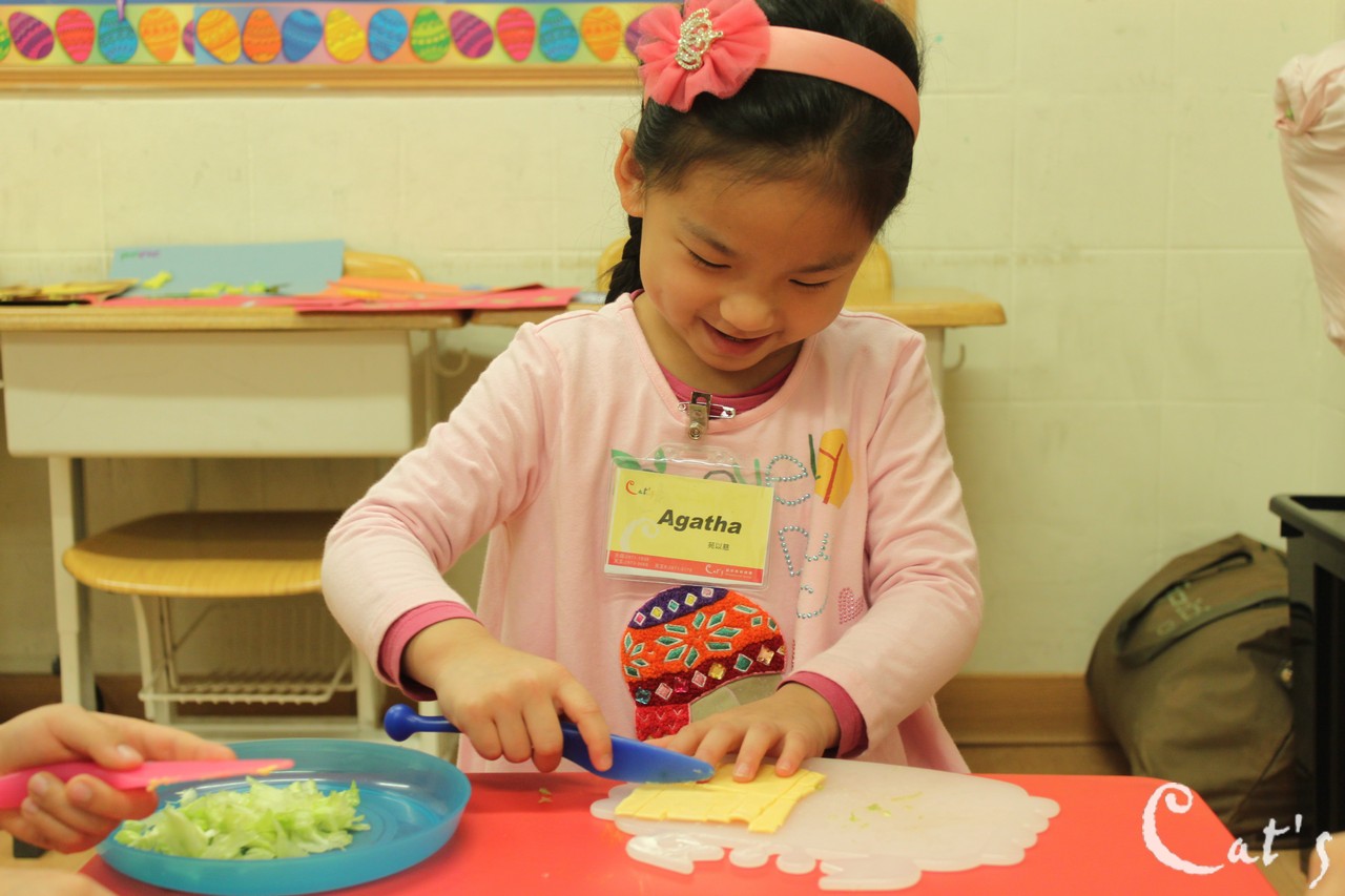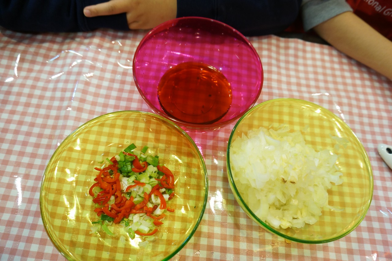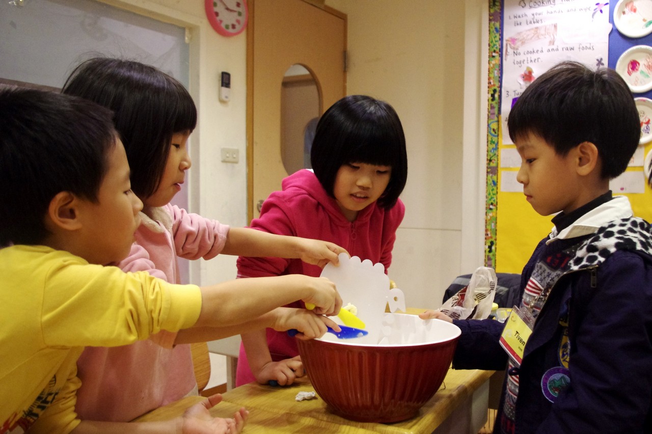 Jazz, Sophie and Kitty taking turns to cut bananas