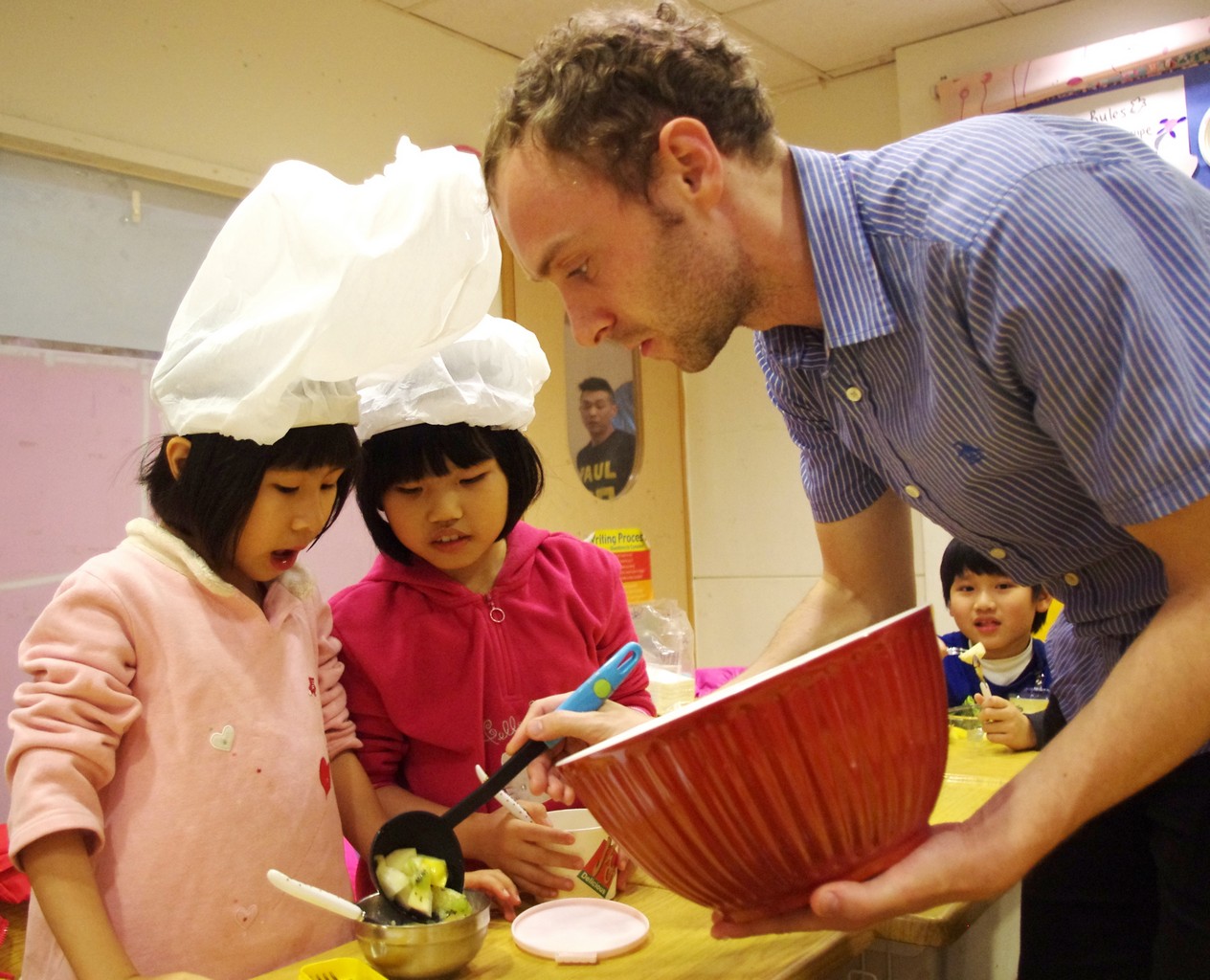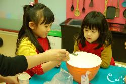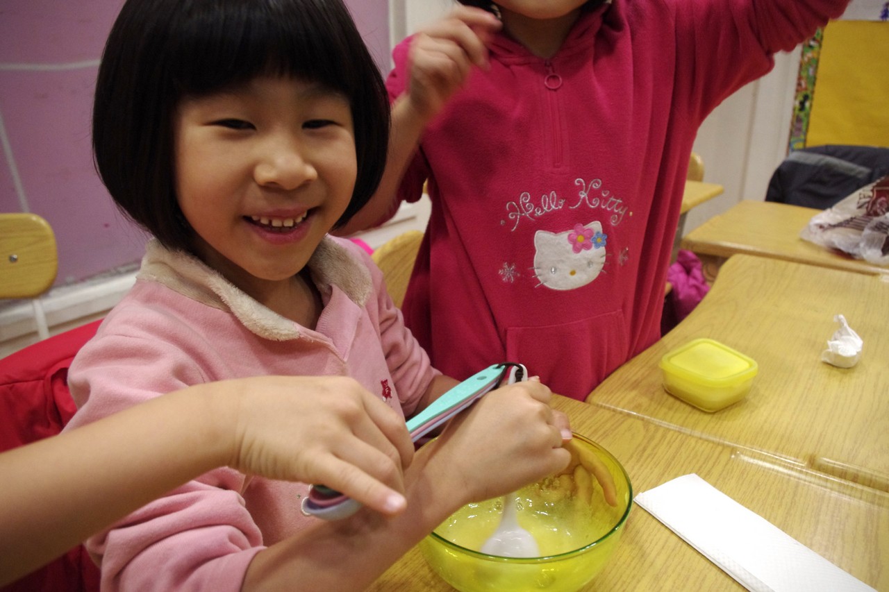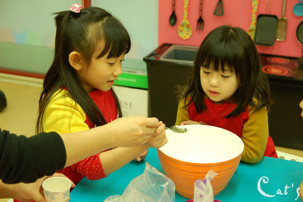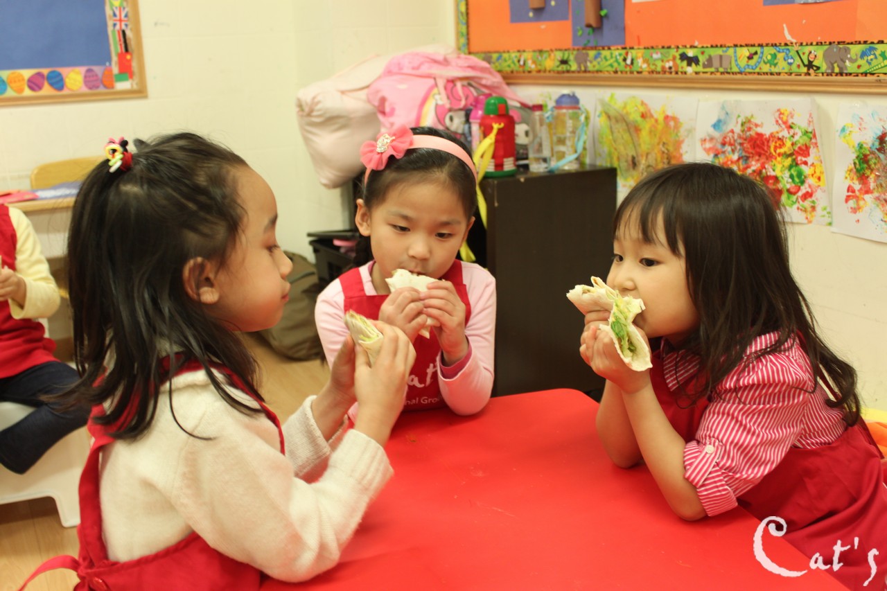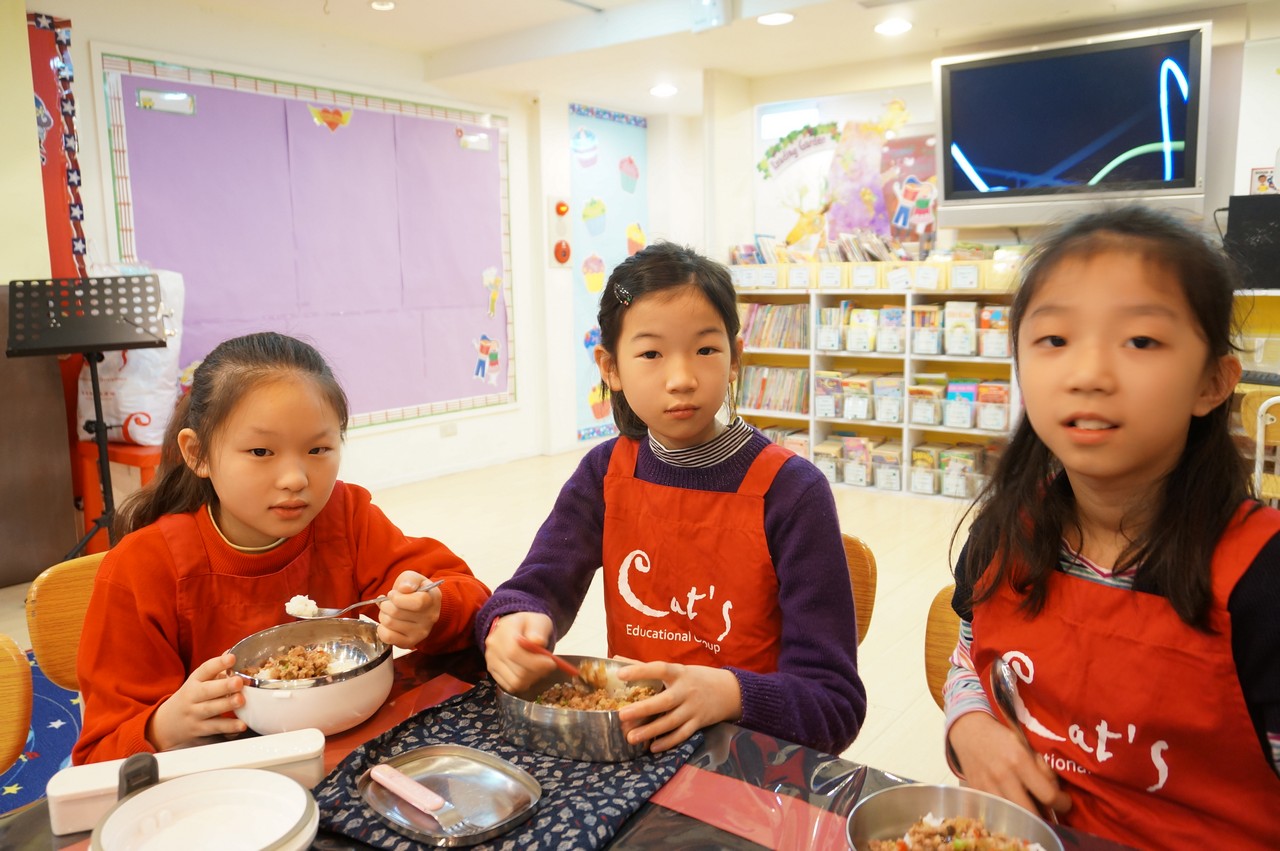 Jazz, Sophie and Kitty taking turns to cut bananas