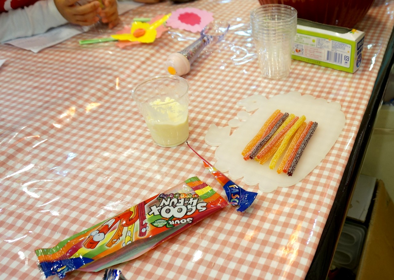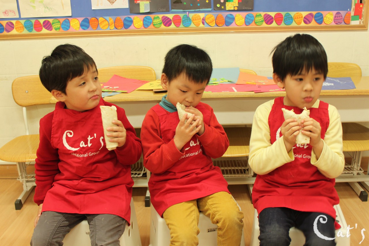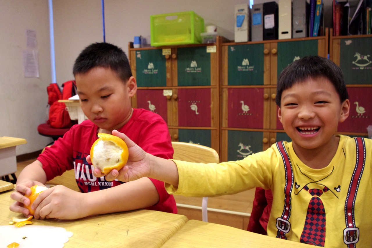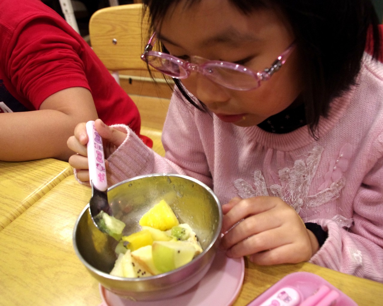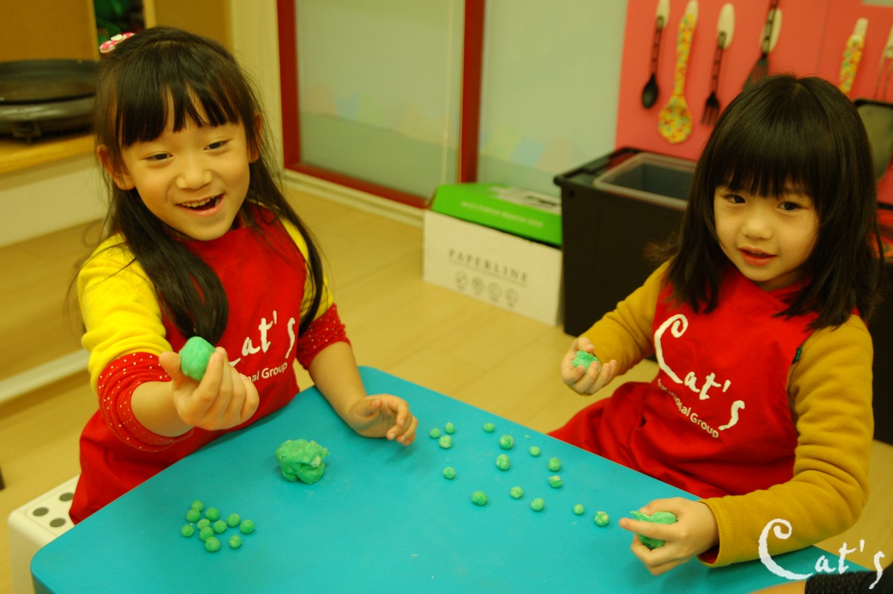 Jazz, Sophie and Kitty taking turns to cut bananas