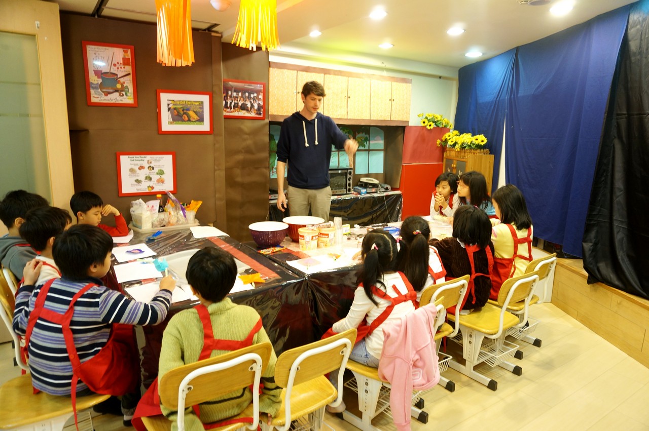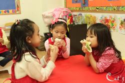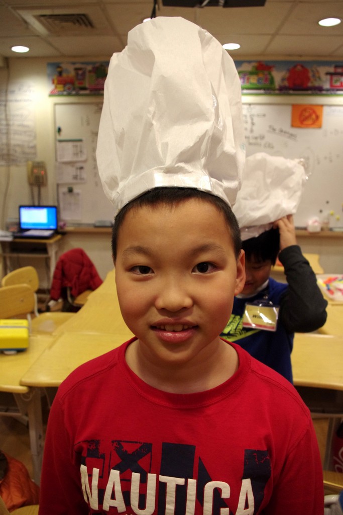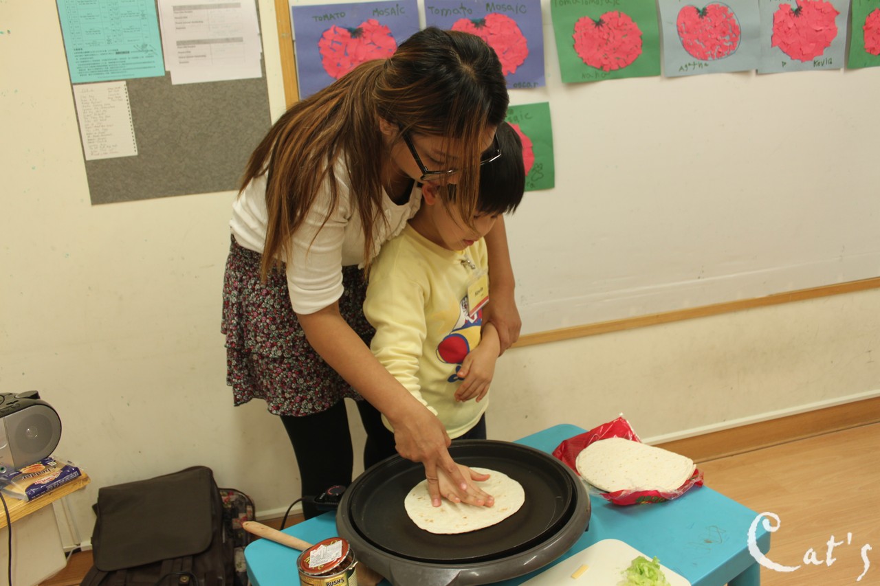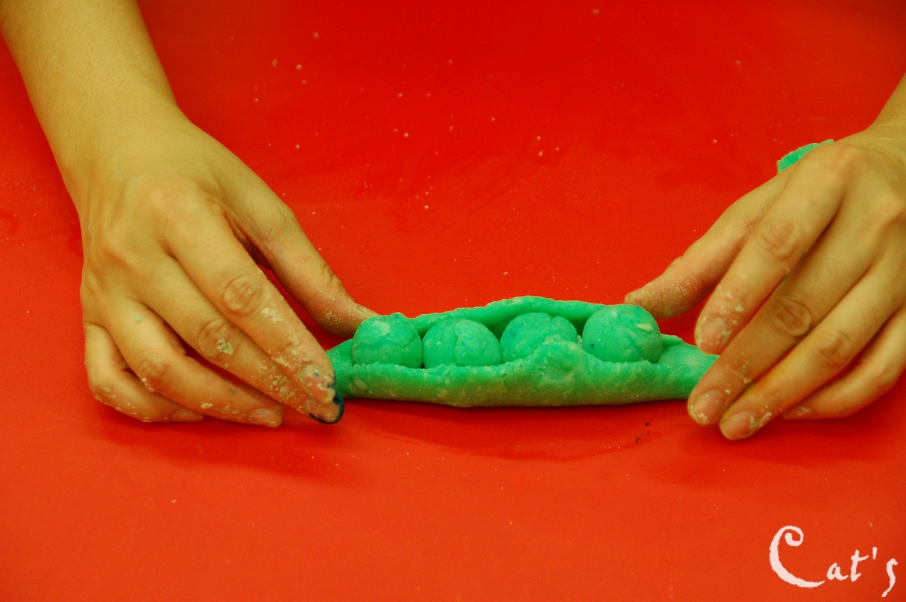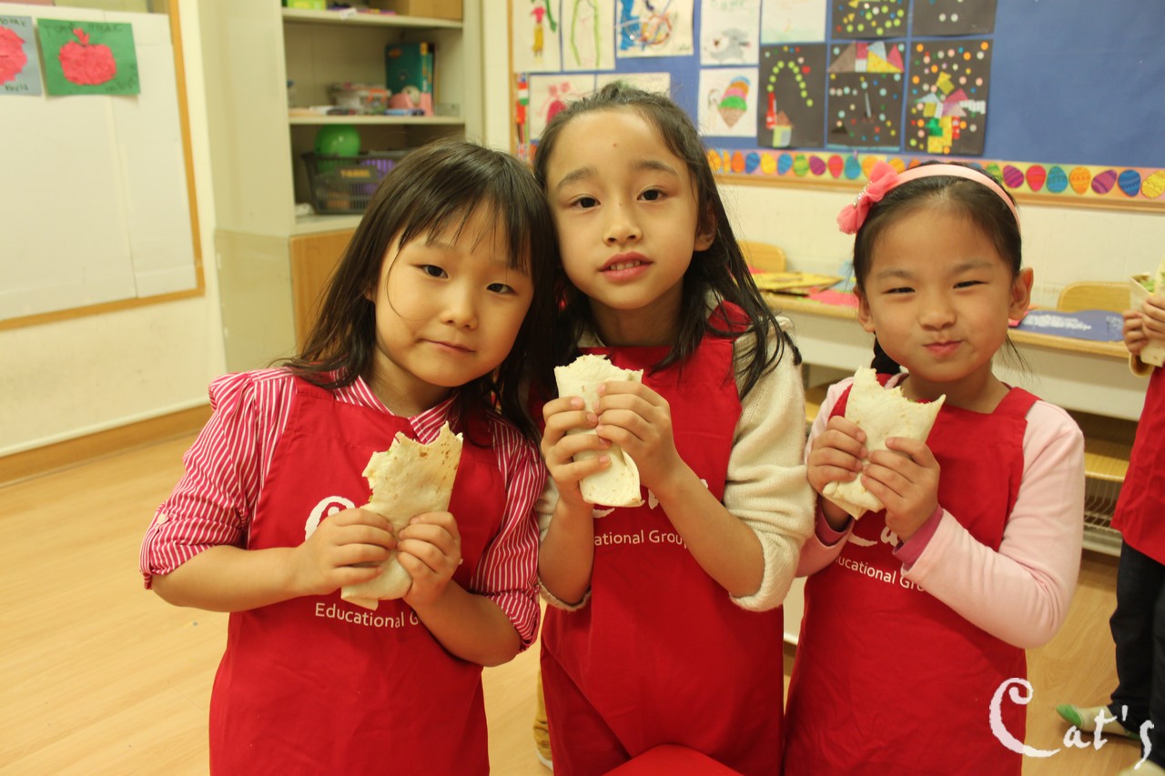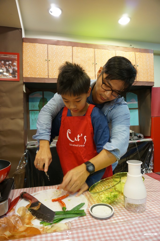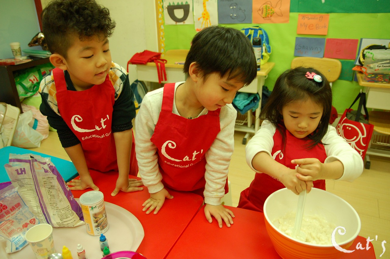 Jazz, Sophie and Kitty taking turns to cut bananas