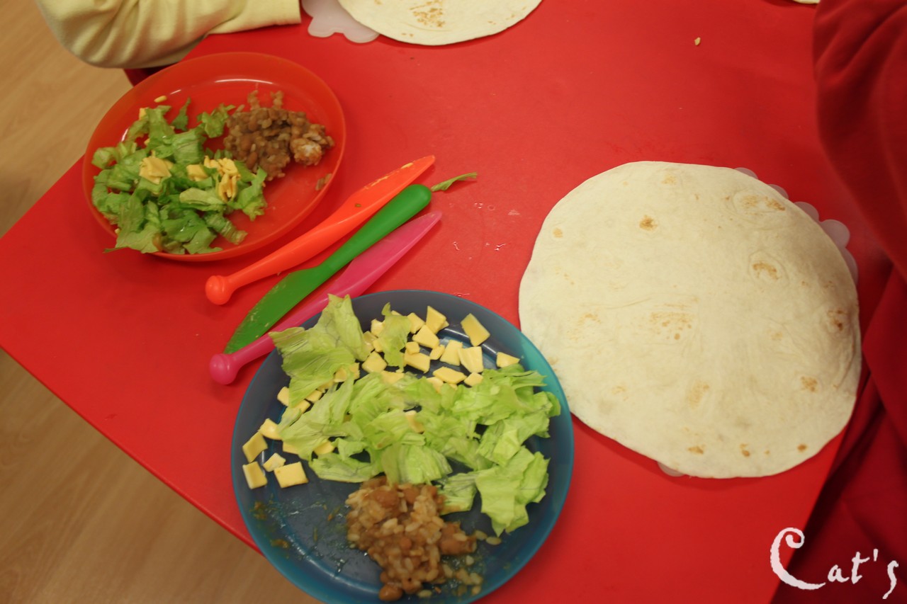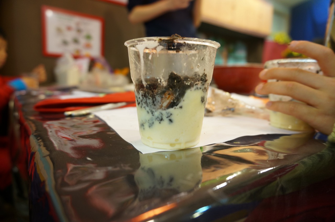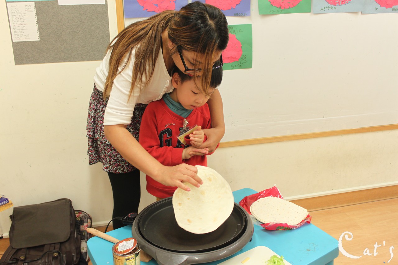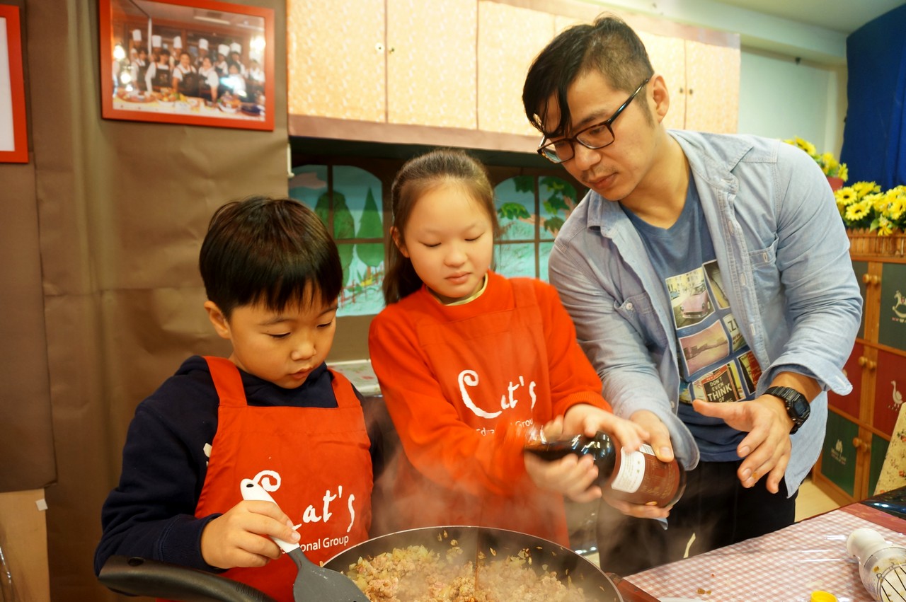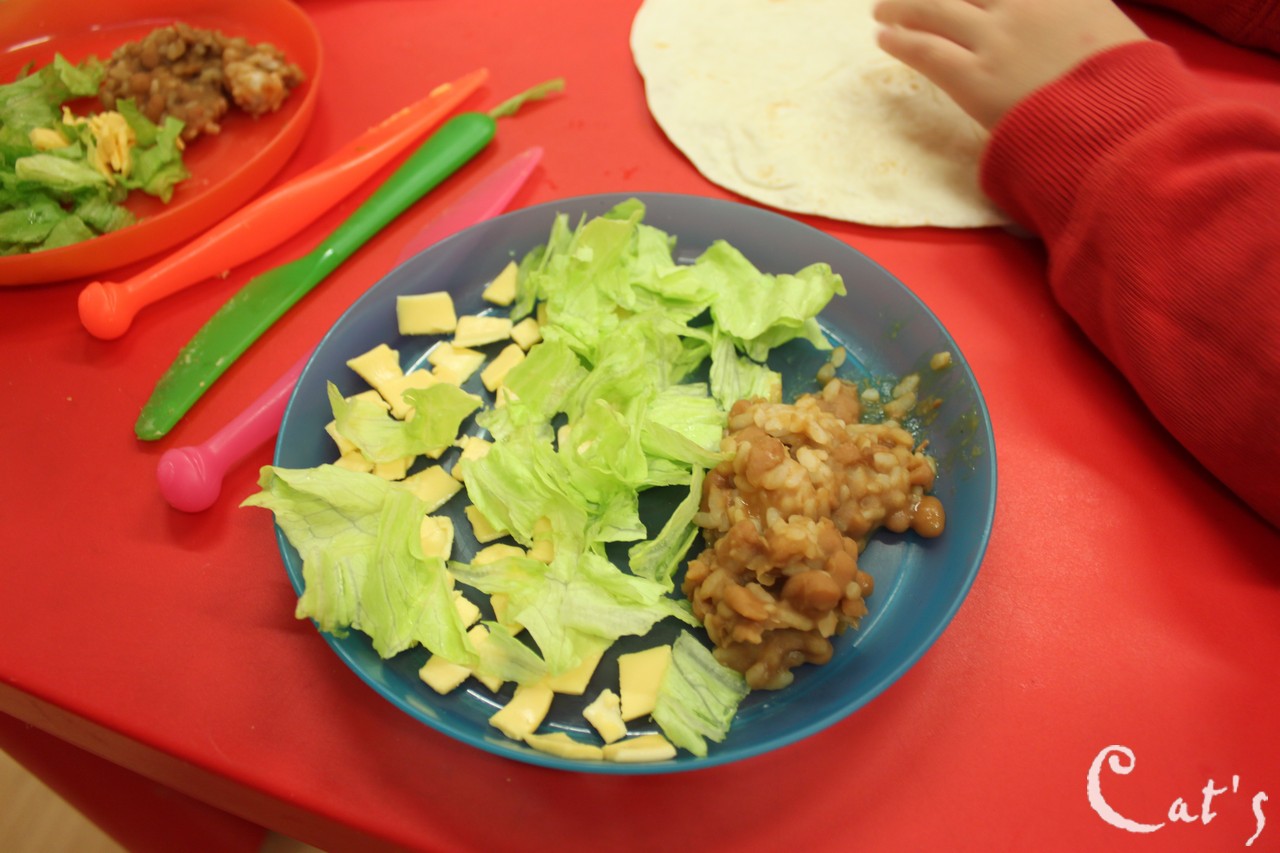 Jazz, Sophie and Kitty taking turns to cut bananas