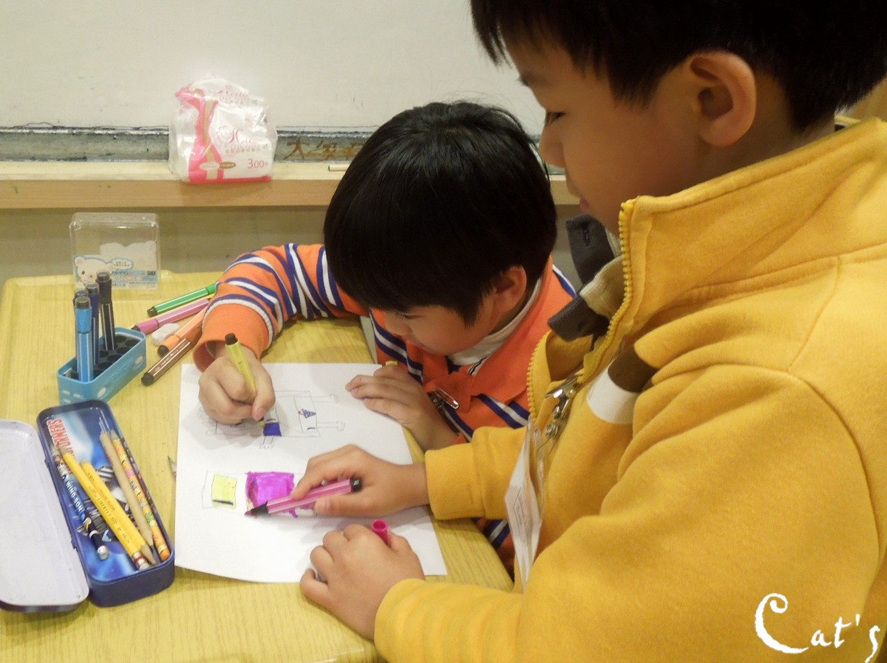 Willie and Tiven drawing pictures of the things he tasted today!