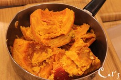 先將蒸熟的南瓜撥小塊放入平底鍋中~