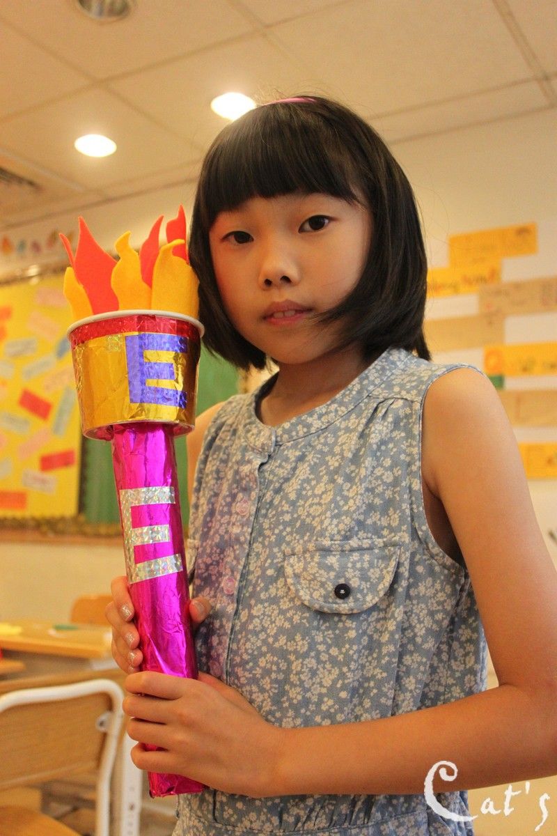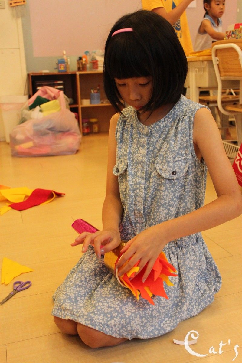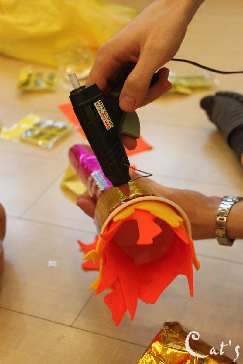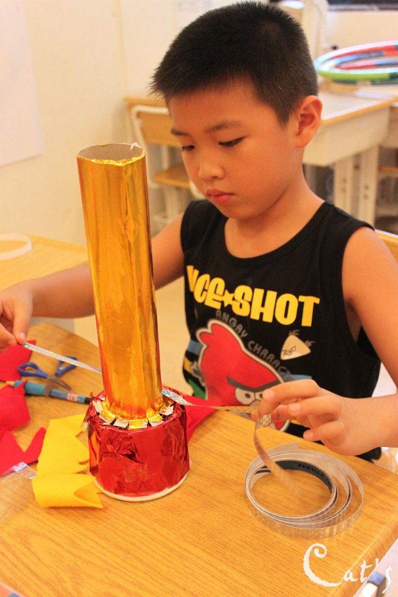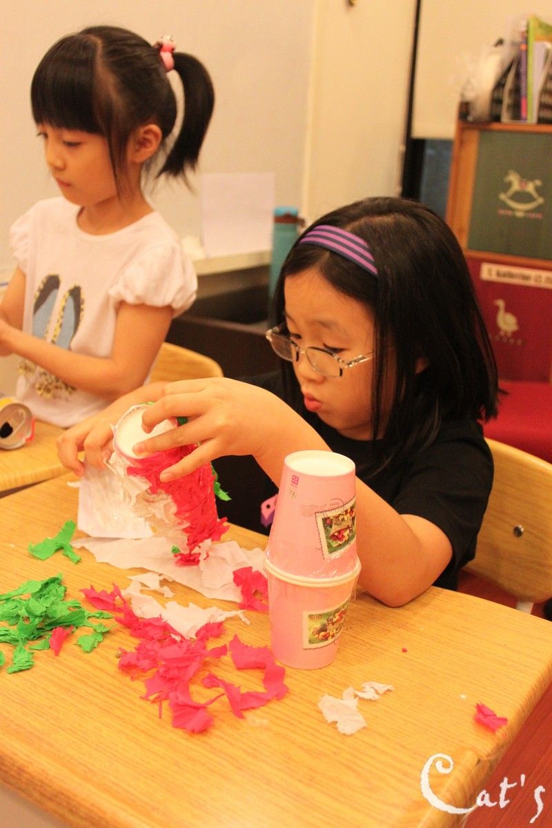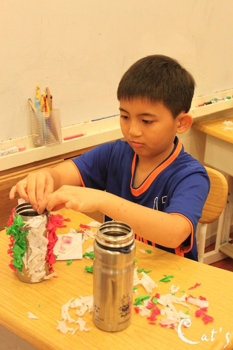 用包裝紙纏繞紙碗以及厚紙板做成的圓柱狀手把
