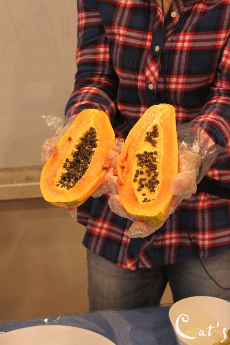 Cut the papaya in half.
