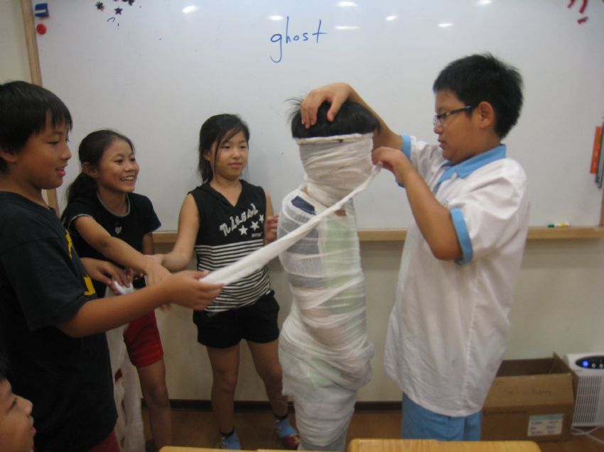 今年Halloween活動競賽中,分組進行比賽,先完成綑木乃伊的組別便可贏得勝利。Teacher Brian & Teacher Dylan被小朋友綑成木乃伊,看來TTeacher Brian真得動彈不得囉!