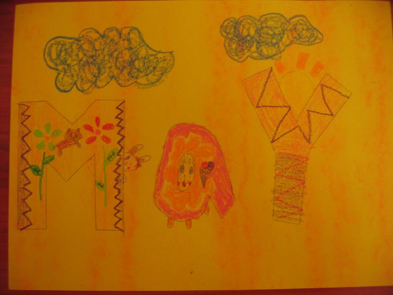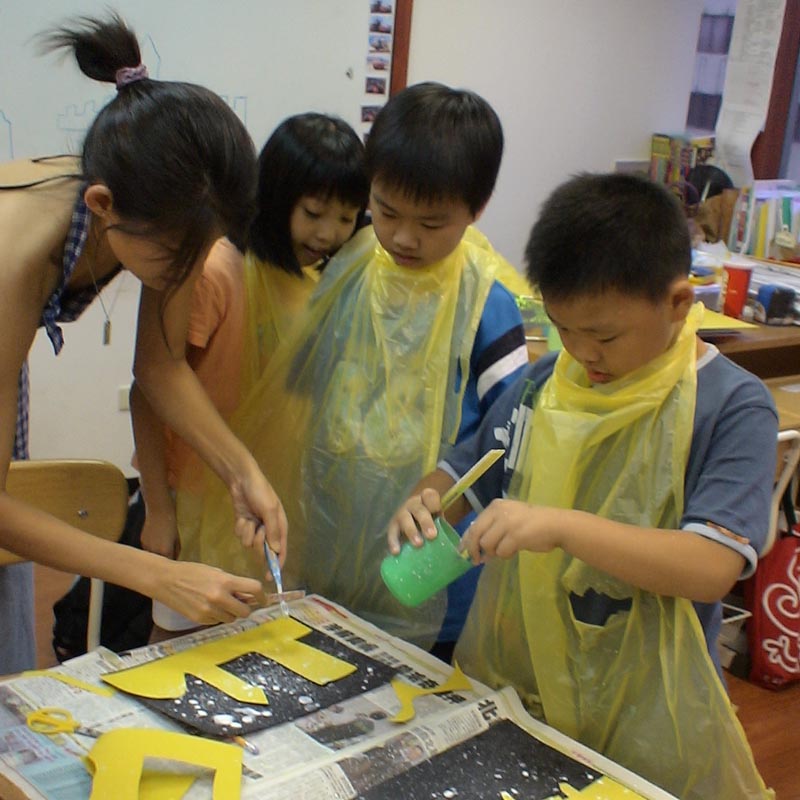 Teacher Linda 示範如何將刷子上的顏料用刮棒刮在黑色畫紙上
