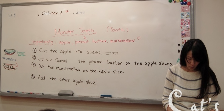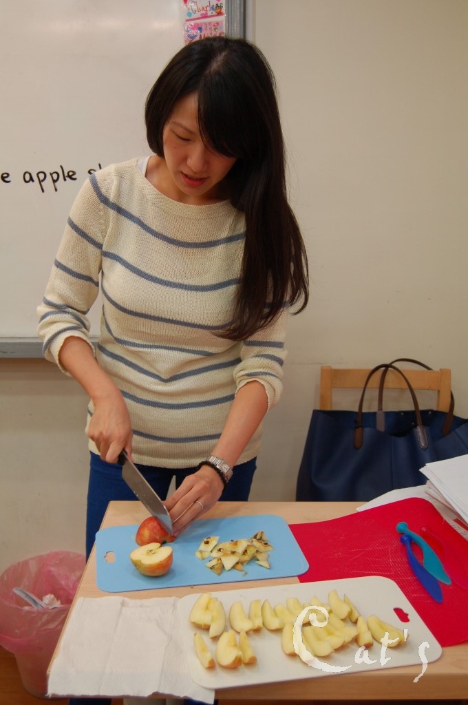Tr. Tina wrote the instructions on the board and then helped students cut the apples into pieces